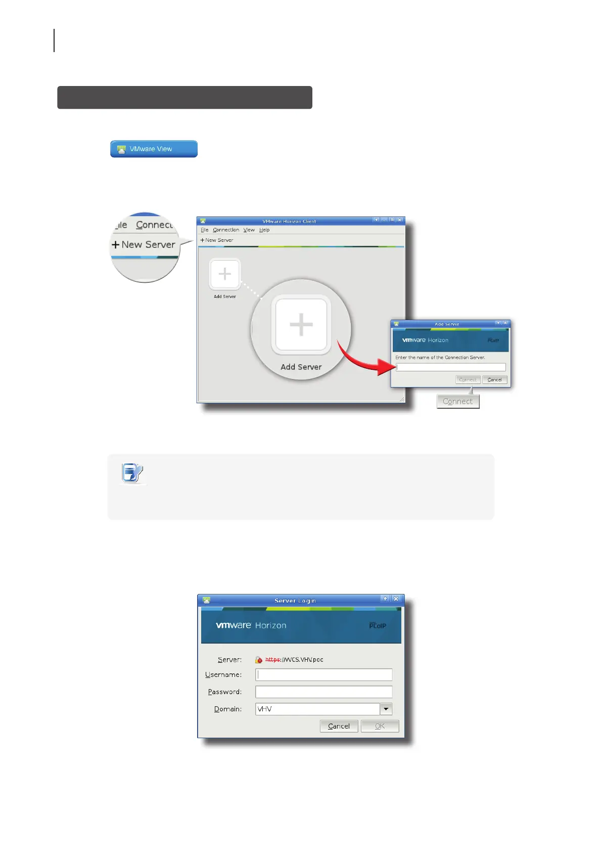 appears prompting for the name or IP address of the VMware View Connection Server.