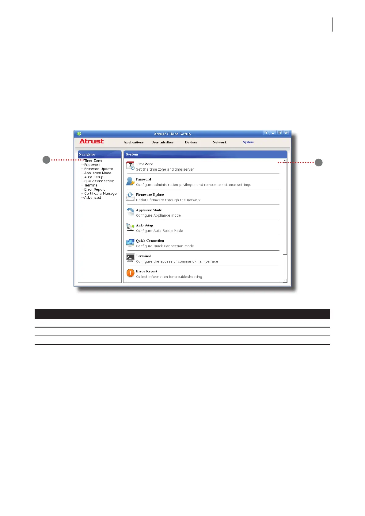 1 Navigation area Click to select a setting item under System tab.