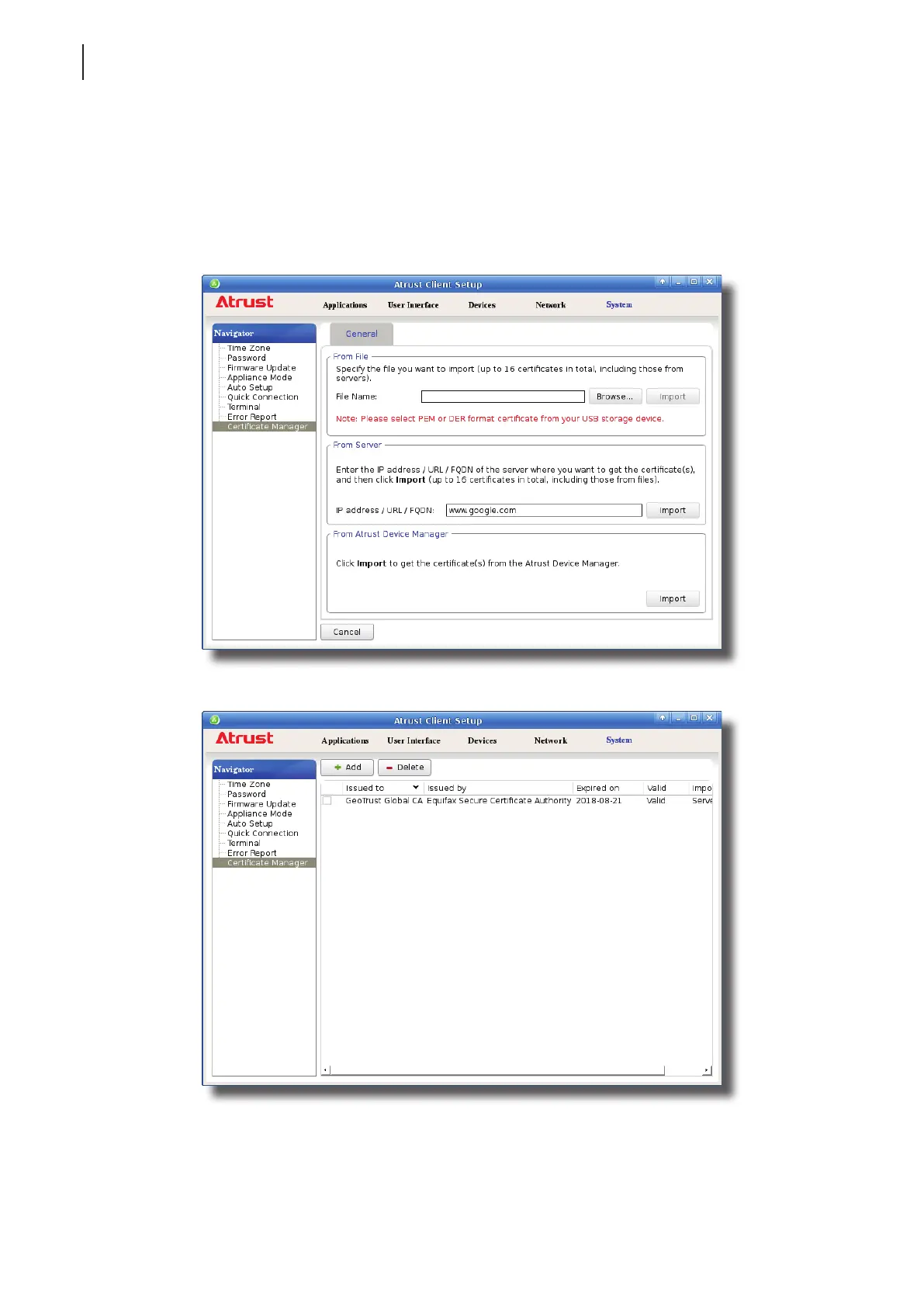 1. On Atrust Client Setup, click System > Certicate Manager.