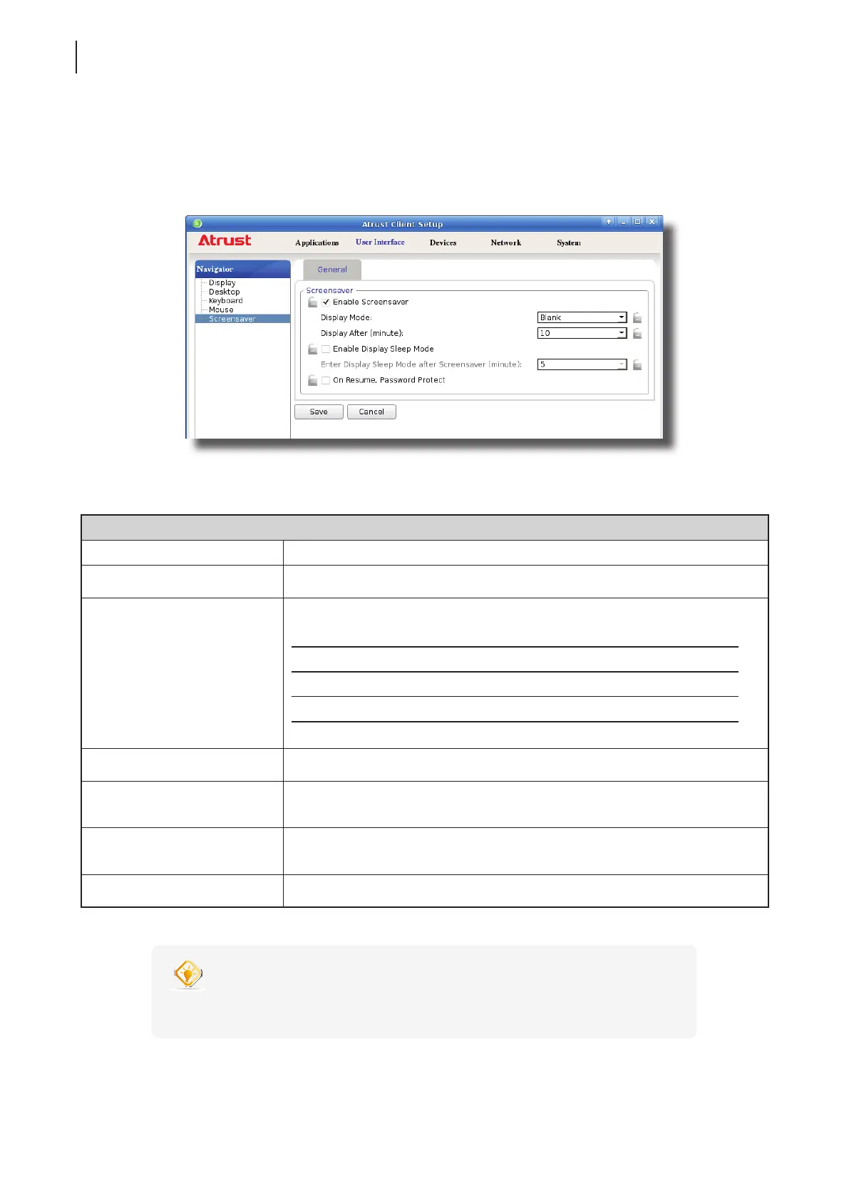 1. On Atrust Client Setup, click User Interface > Screensaver.