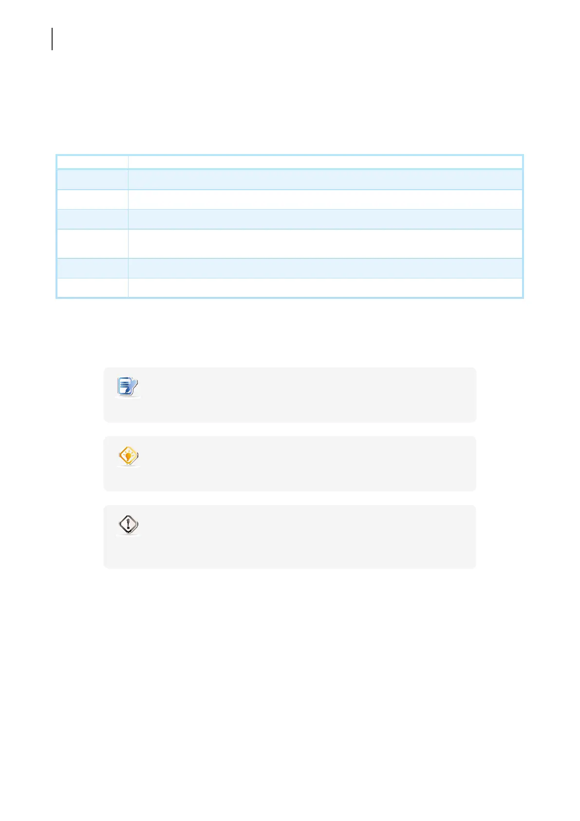 Throughout this manual, the notes, tips, and warnings in the following formats are used to provide important