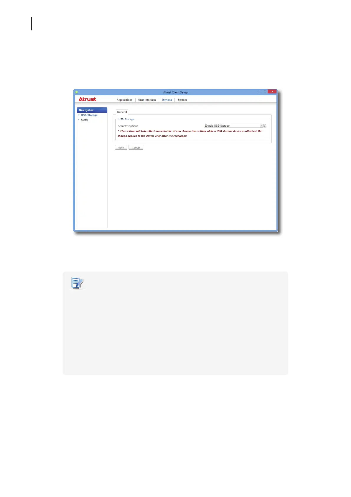 1. On Atrust Client Setup, click Devices > USB Storage.