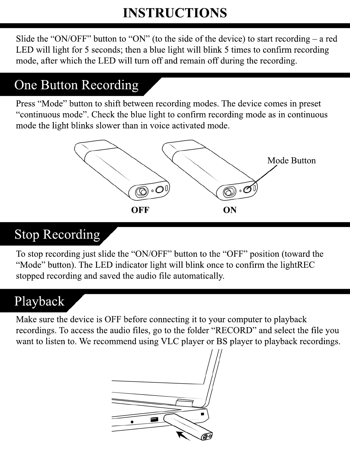 Make sure the device is OFF before connecting it to your computer to playback