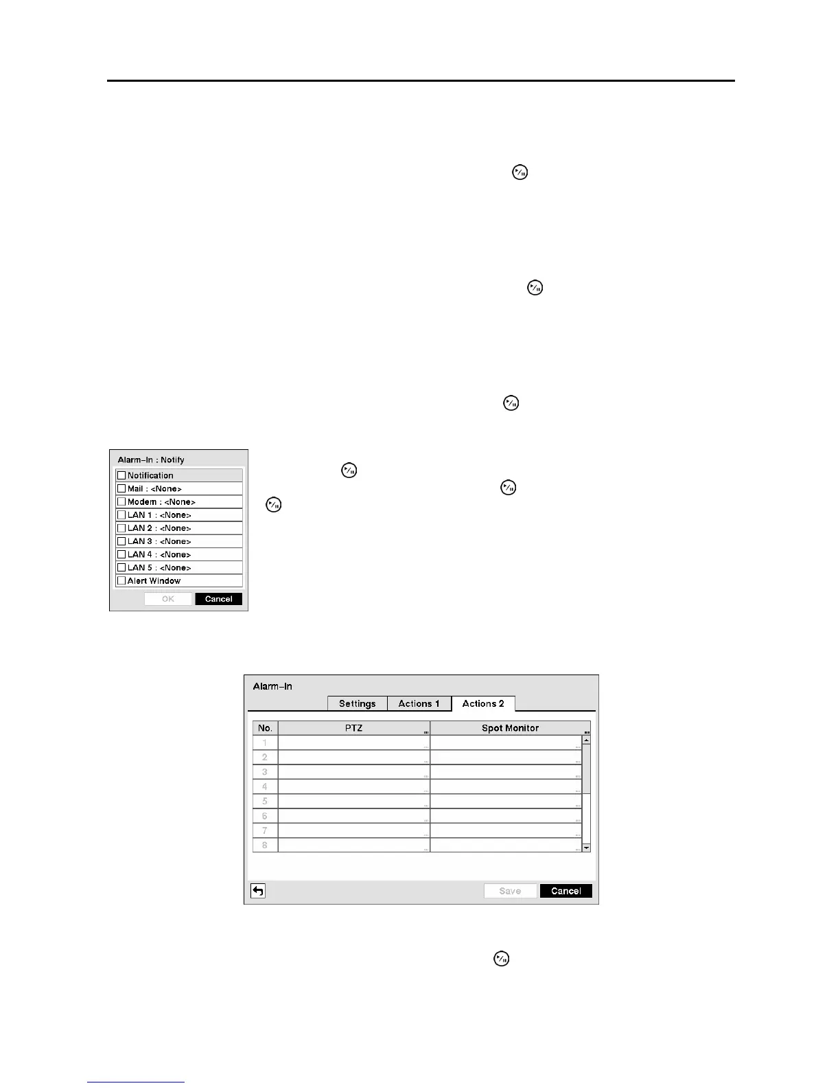 Highlight the desired box under the Notify heading, and press the button. The Alarm-In Notify menu