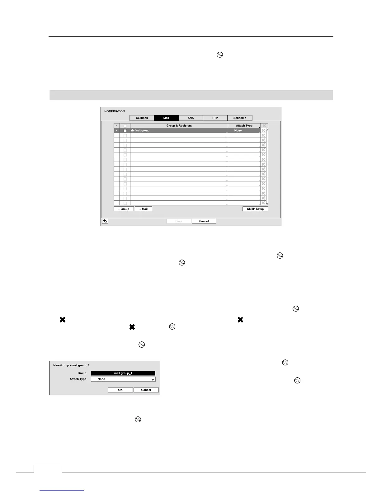 The DVR can be set up to send an email when an event occurs. The Mail Group and Recipient can be turned On or Off