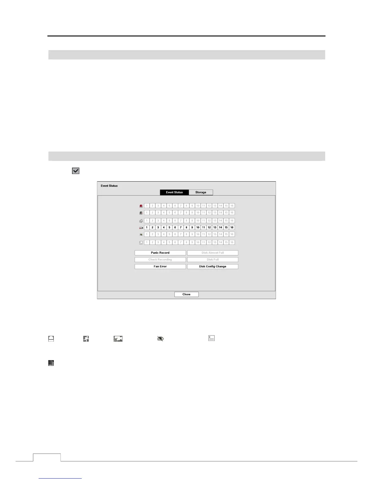 The Event Status screen displays the status of the DVR’s systems and inputs. Events will be highlighted, and related