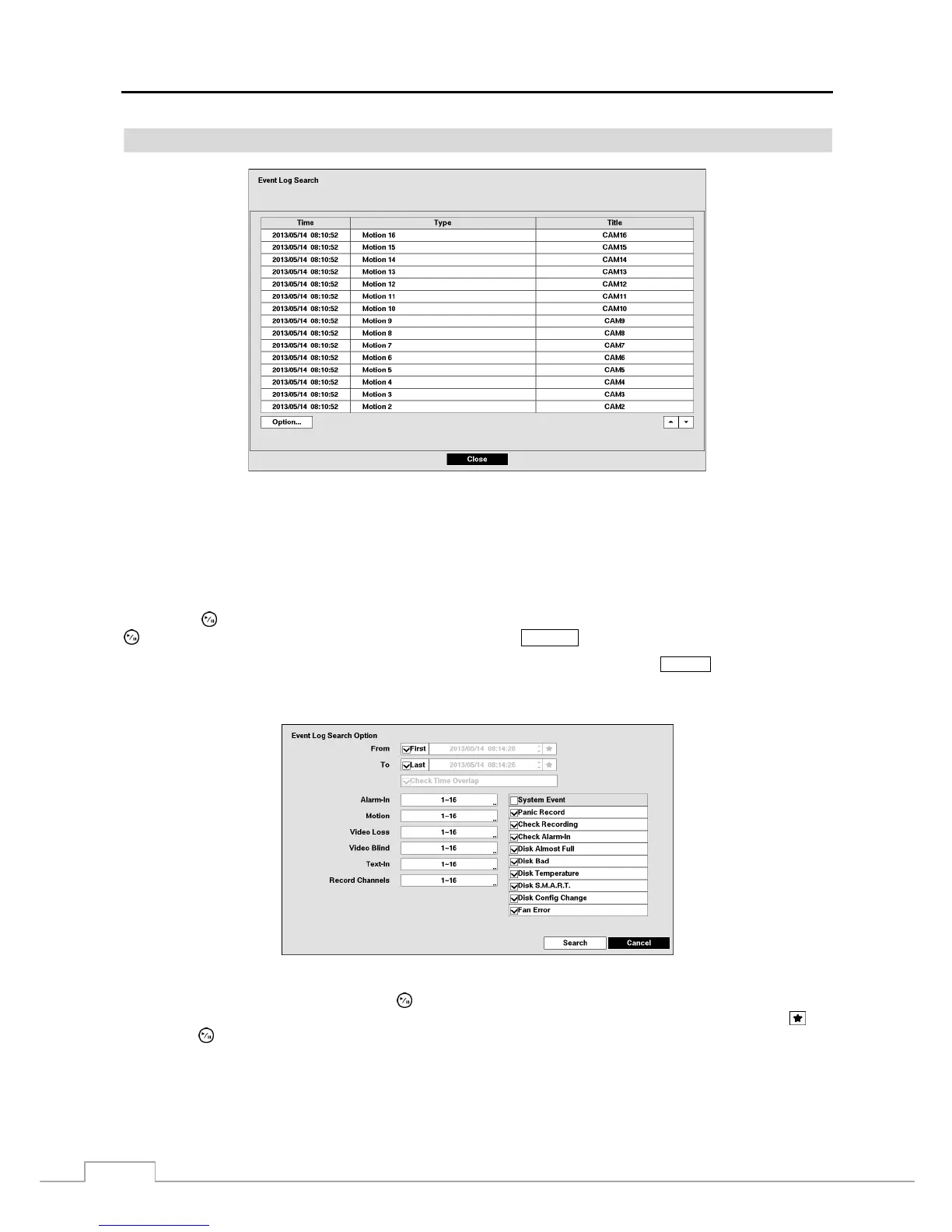 The DVR maintains a log of each time the Alarm Input port is activated. The Event Log Search screen displays this