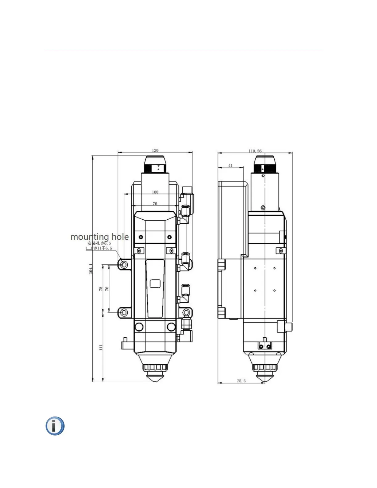 Figure 3. The size and position of installation hole of A230E fiber laser cutting head.