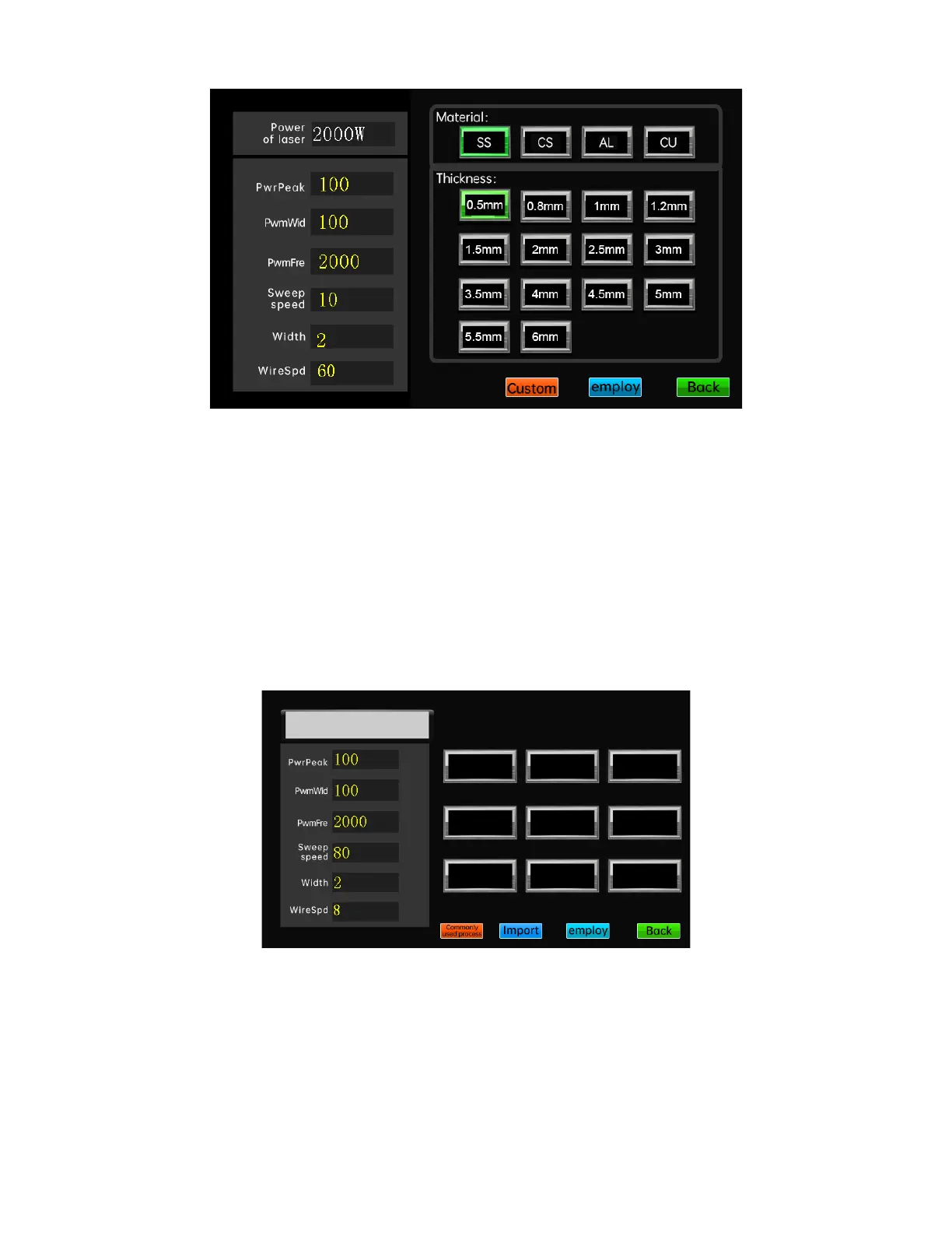 The process interface can store 4 materials, 18 thicknesses, and 6 types of