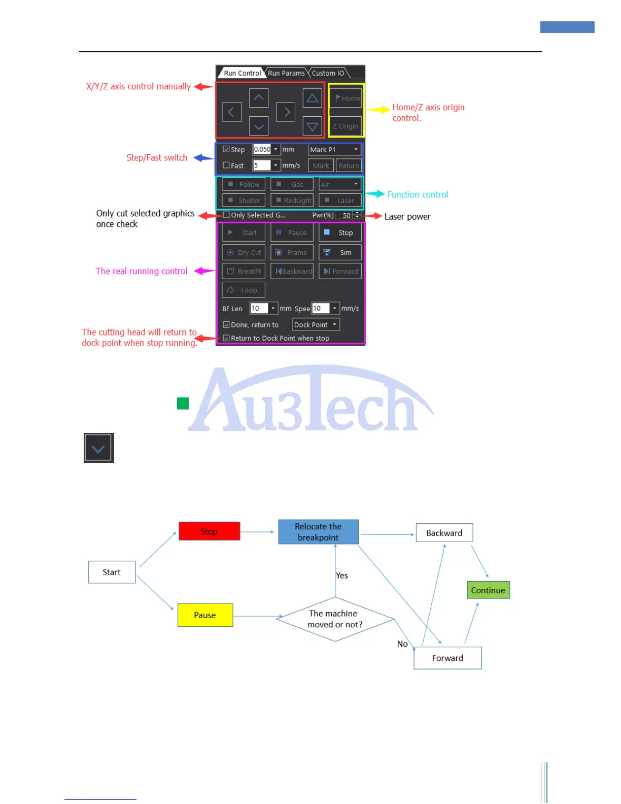 continue the cutting (User also can move the cutting head by “Backward”/”Forward” to the proper