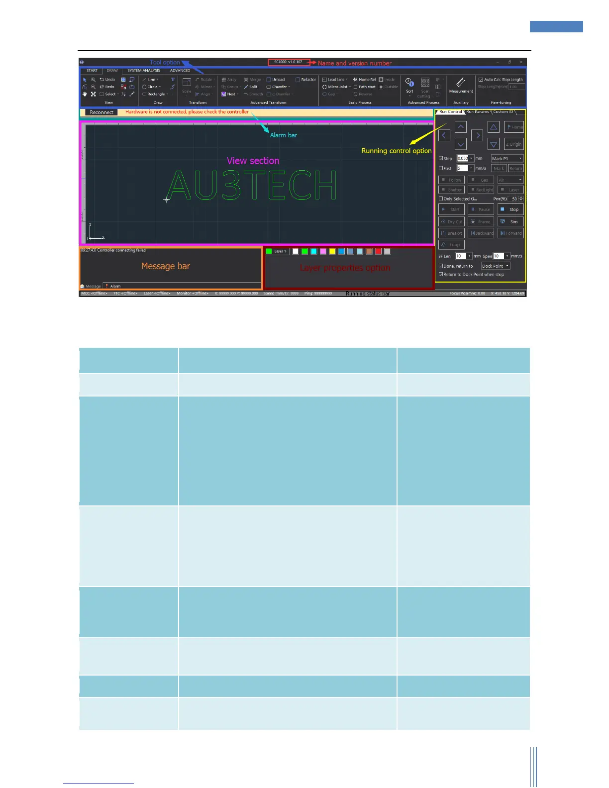 control option, message bar, graphic parameters option, and status bar. The functions of each section