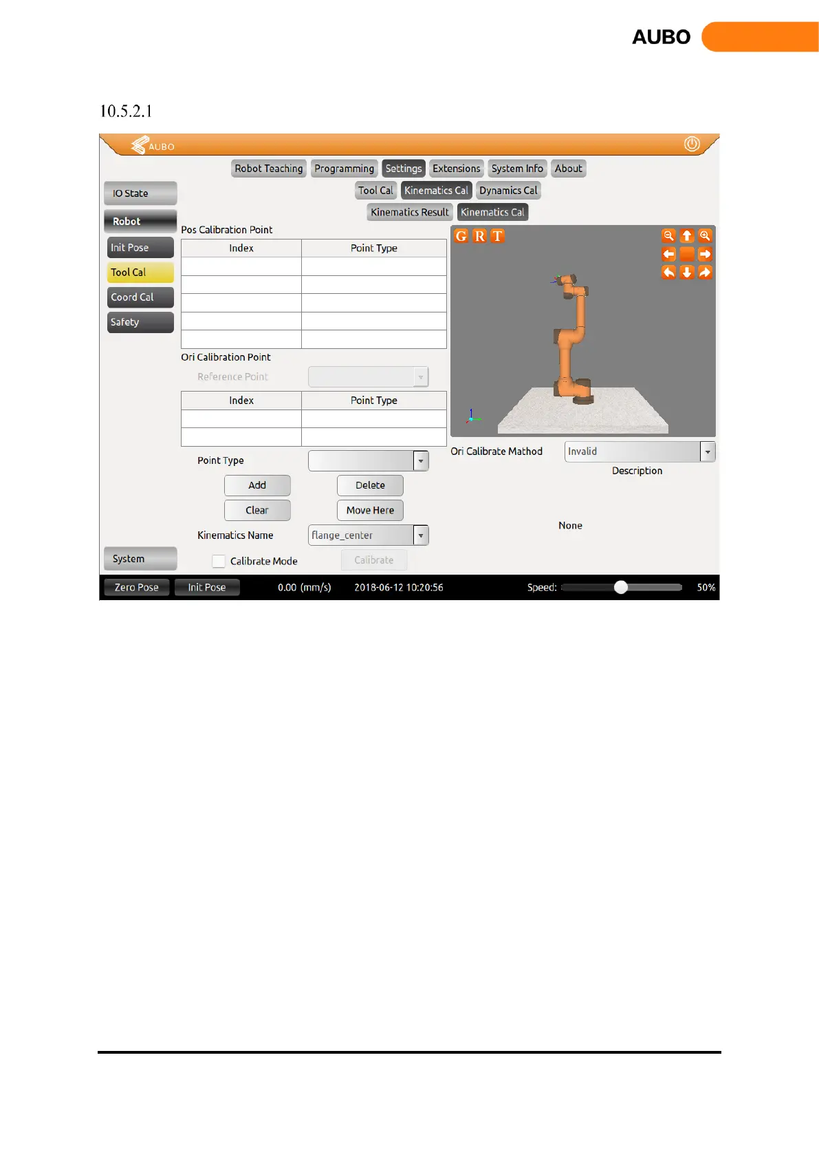 process, move to the reference position first, select Point Type as Ori Calibration, and click Add to enter the