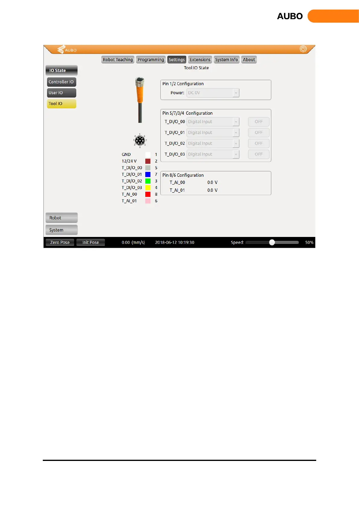 Tool I/O Tab: It is the display of end-effect’s setting status. Users can configure 4 digital I / O by pin