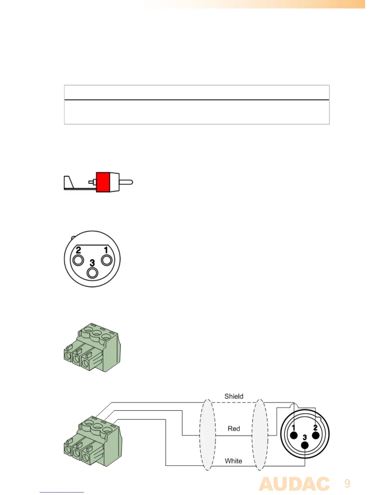 The in- and output connections for AUDAC audio equipment are performed