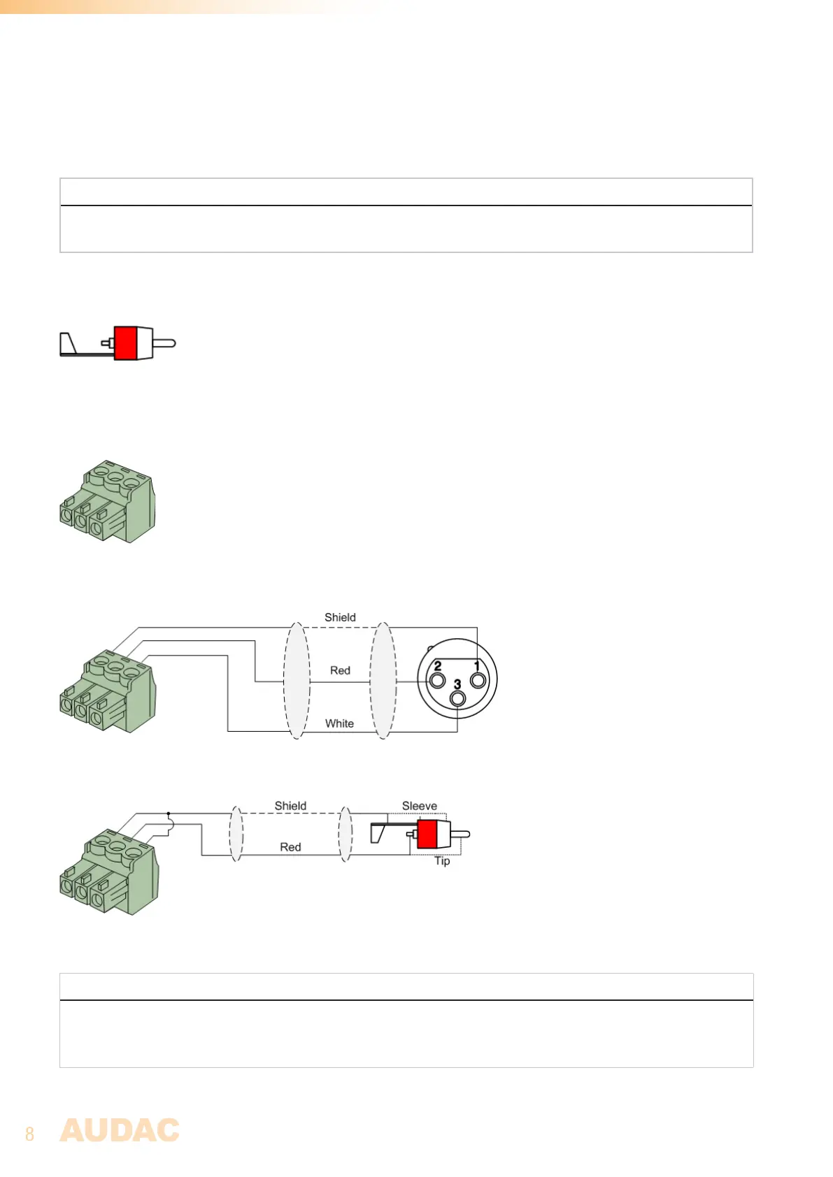 The in- and output connections for AUDAC audio equipment are performed corresponding to international wiring