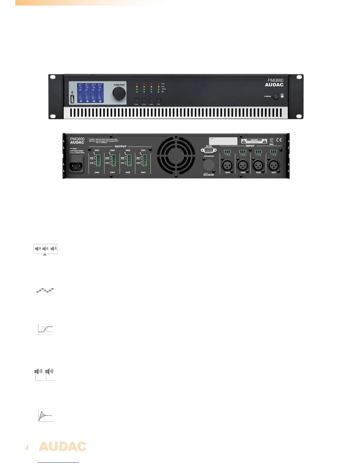 The PMQ series are quad channel Class-D 100V power amplifiers featuring WaveDynamics™ audio processing