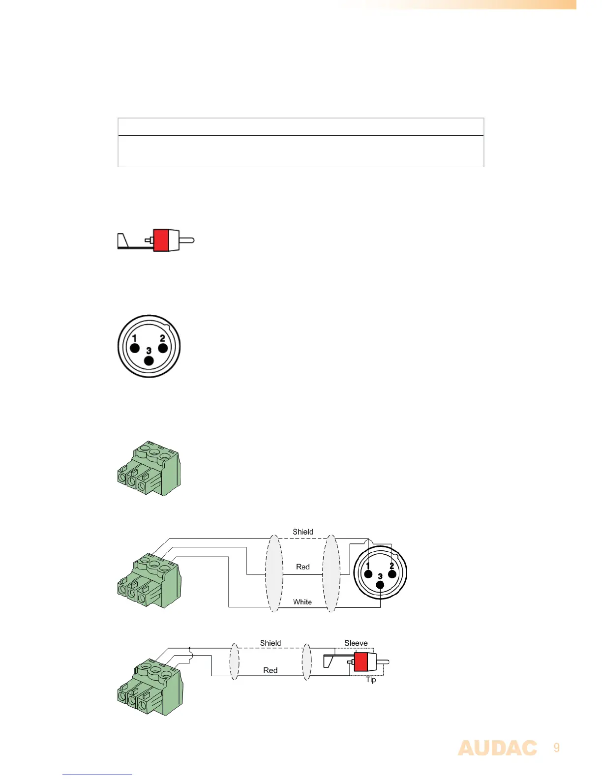 The in- and output connections for AUDAC audio equipment are performed corresponding