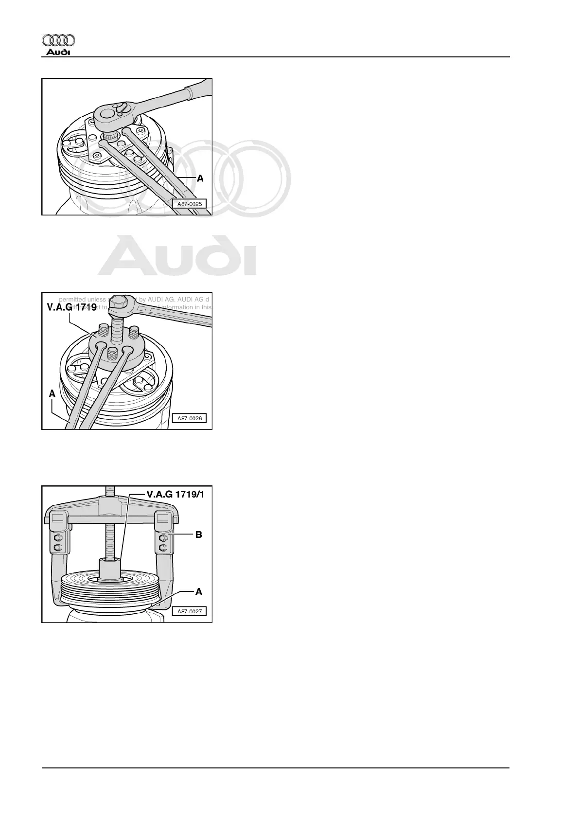 - Position the two-arm puller -B- on the shoulder-A-, to prevent any damage to the pulley.