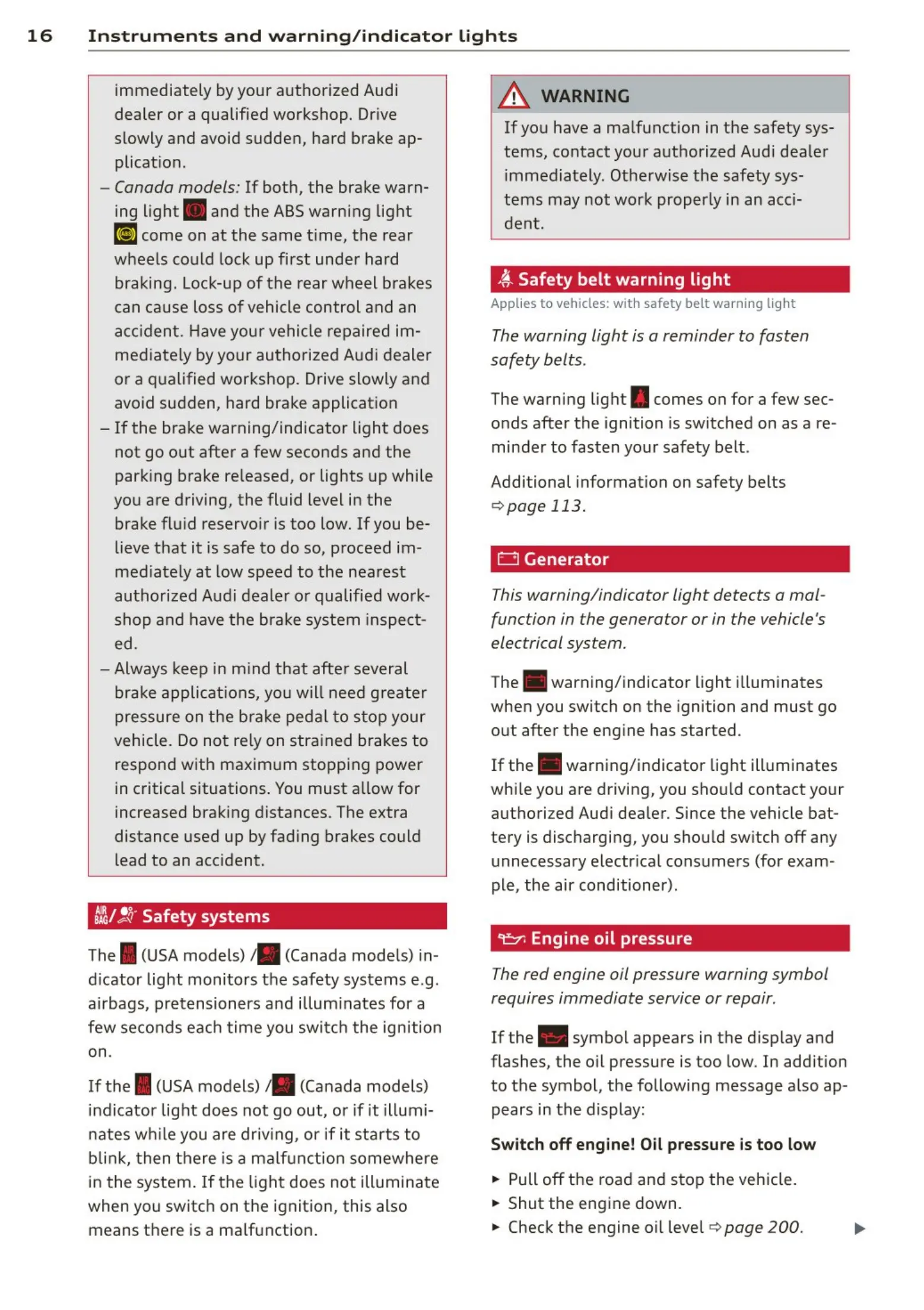 16 In st rum e nt s and w a rn ing /i ndic at o r light s