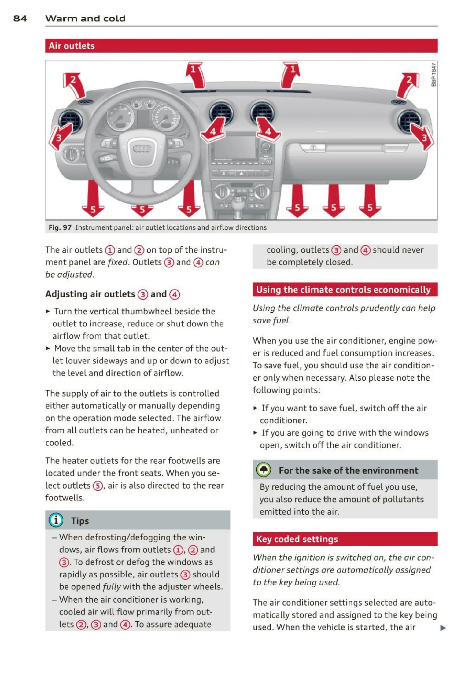 Fig. 97 Instr ument pane l: air outlet locat ions and airflow directions
