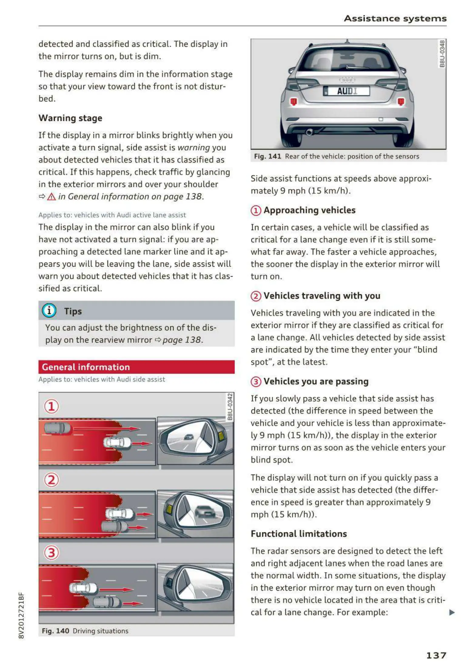 Side assist funct ions at speeds above approxi-