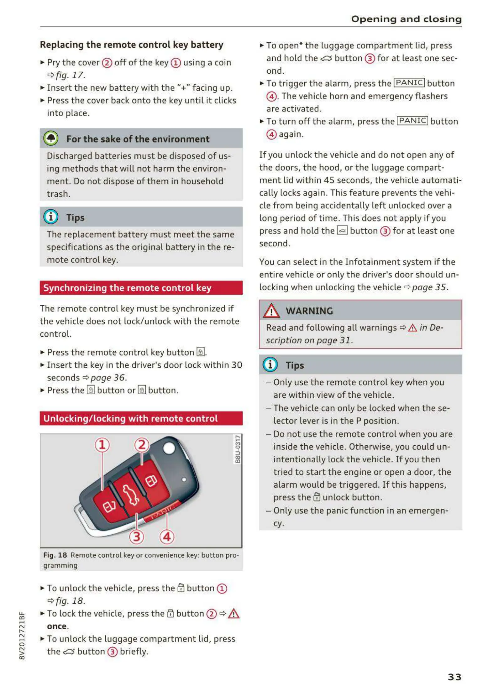 Fig. 18 Remote cont rol key or convenience key: butto n pro -