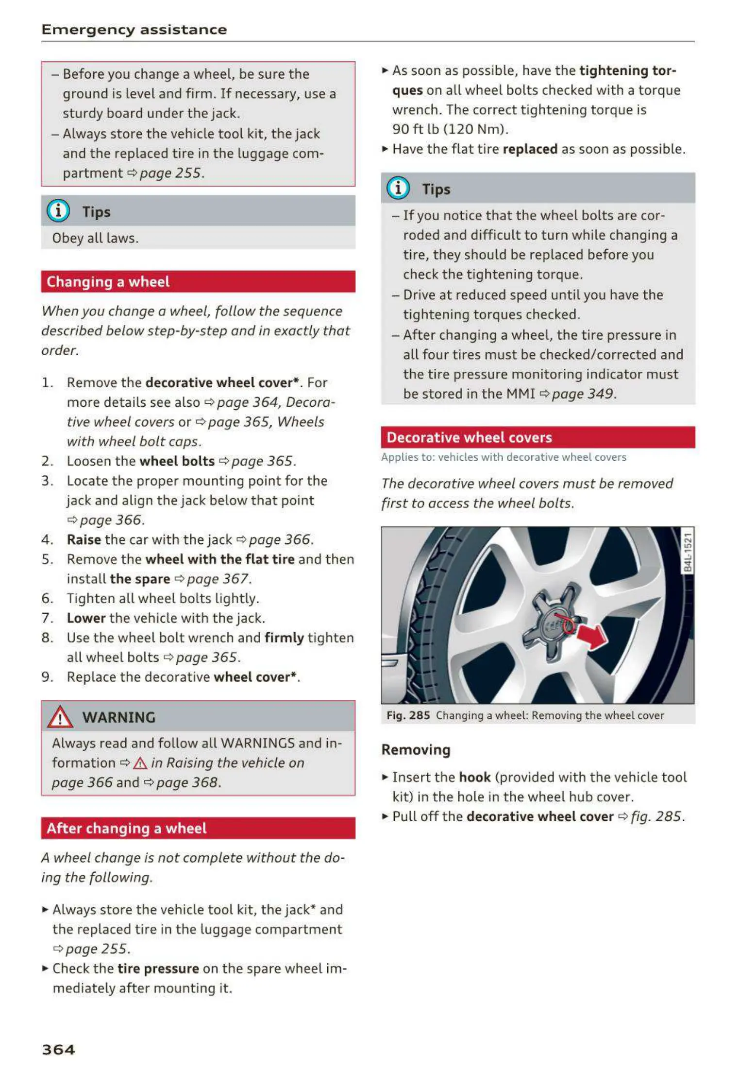 .,. Pull off the decorative wheel cover c:> fig . 285 .