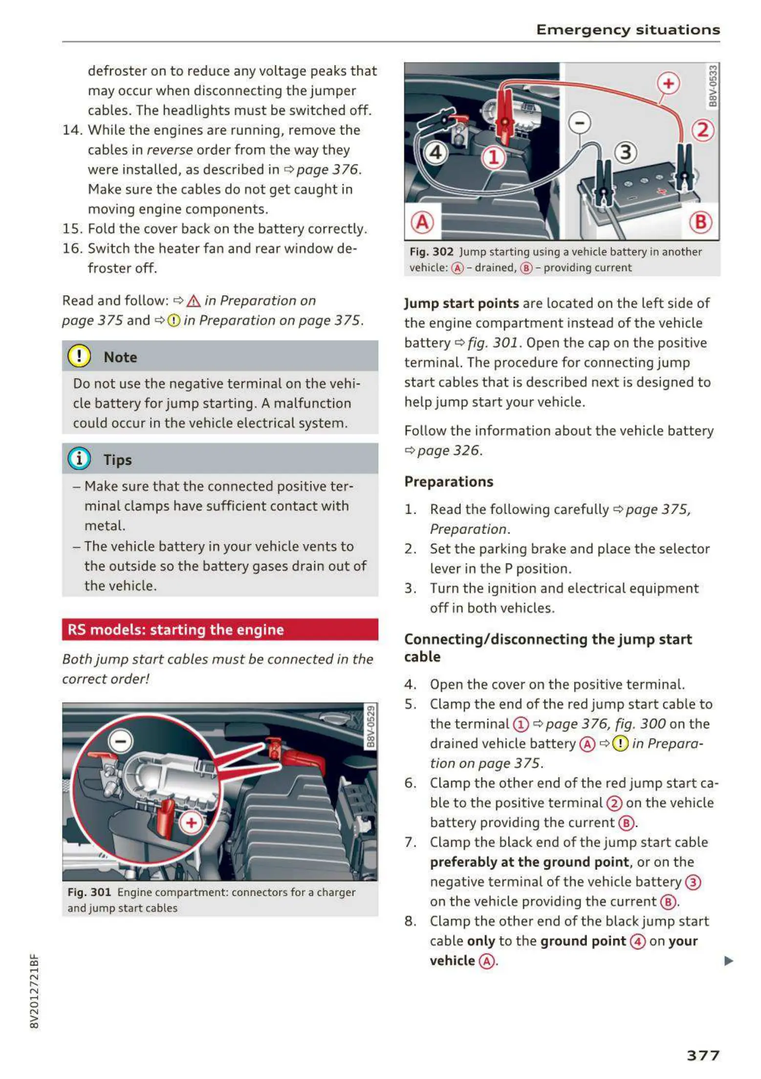 Fig. 302 Jump start ing using a vehicle batt ery in anothe r