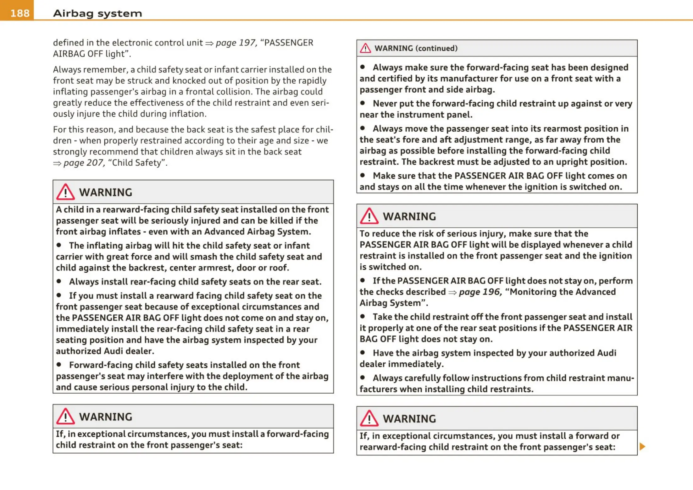 • If you must install a rearward facing child safety seat on the