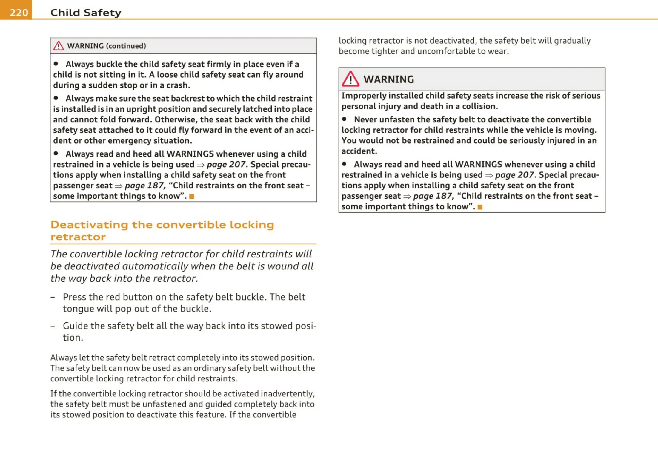 page 187, "Child restraints on the front seat -