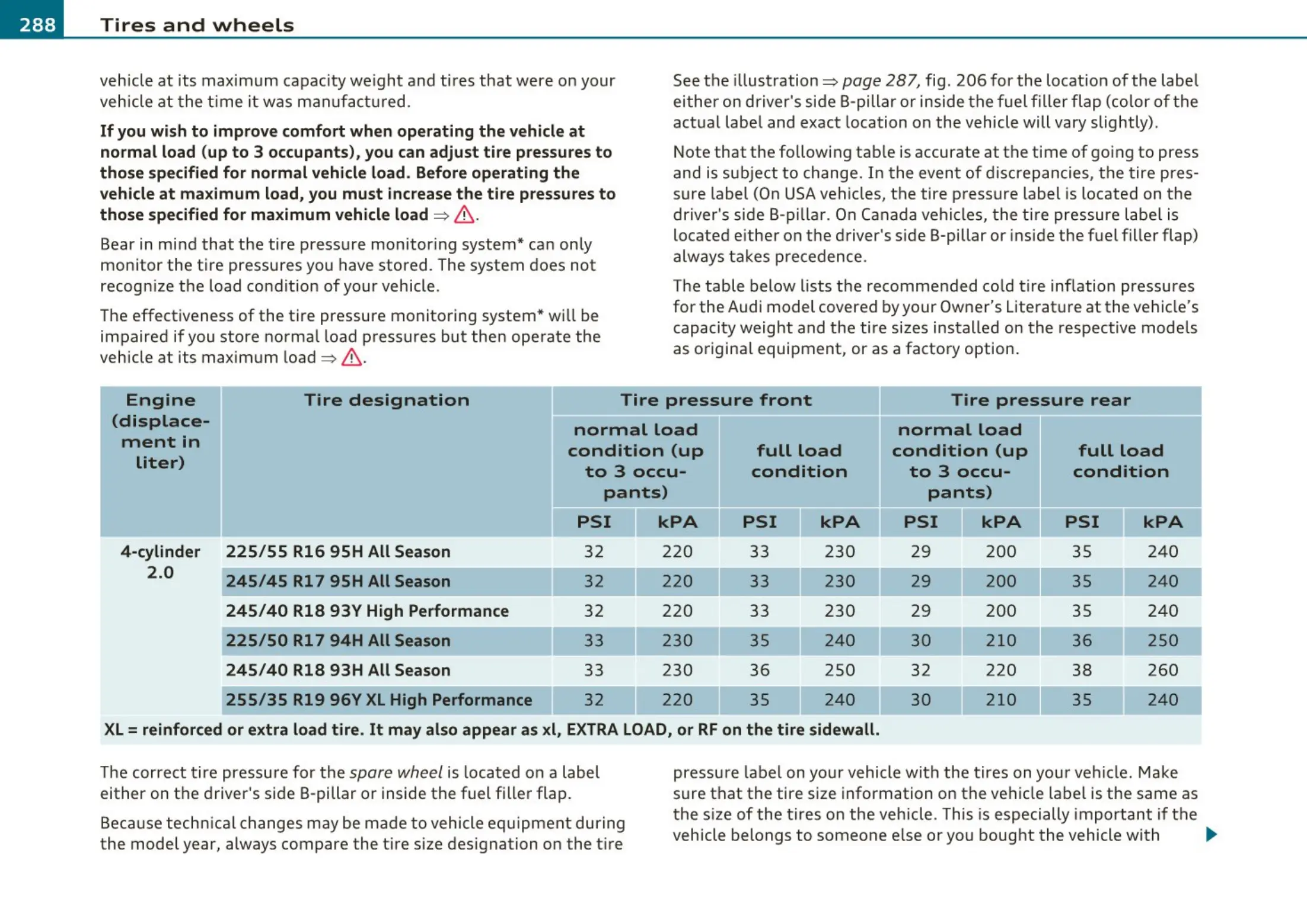 The cor rect tire pressu re for the spare wheel is located on a label