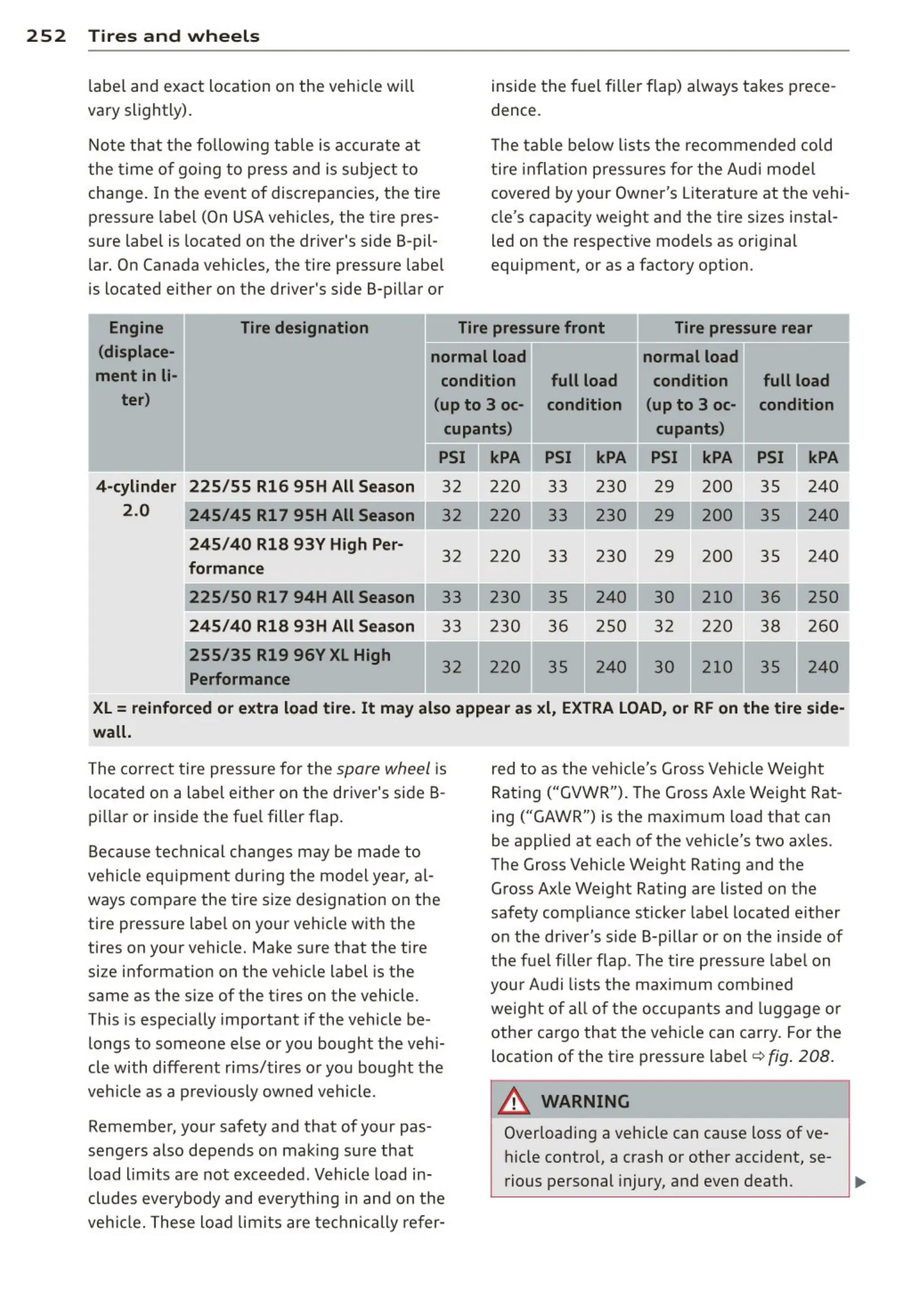 t ire inflat ion pressu res for the Aud i mode l