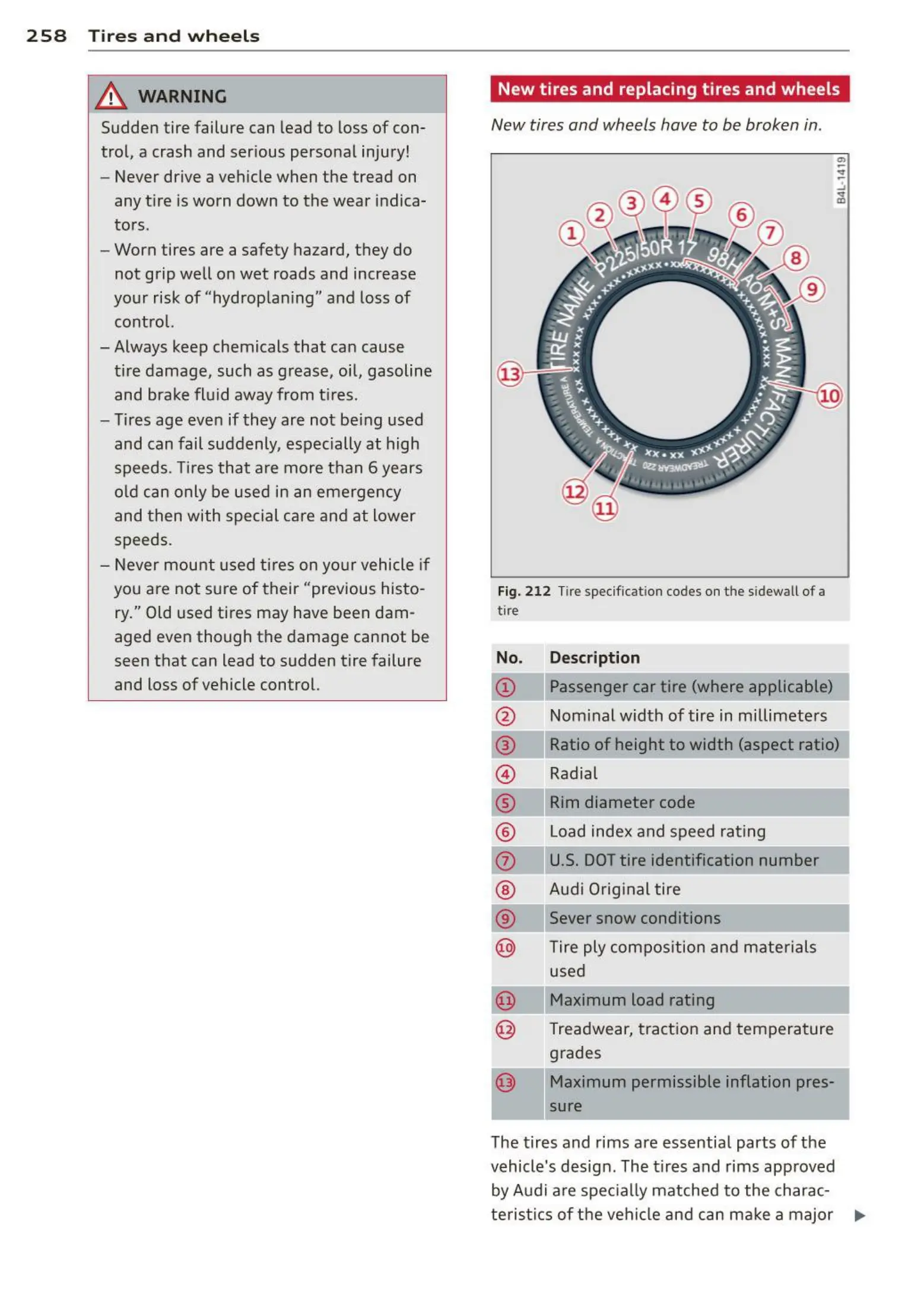 Fig. 212 Tire specificat ion codes on the sidewall of a