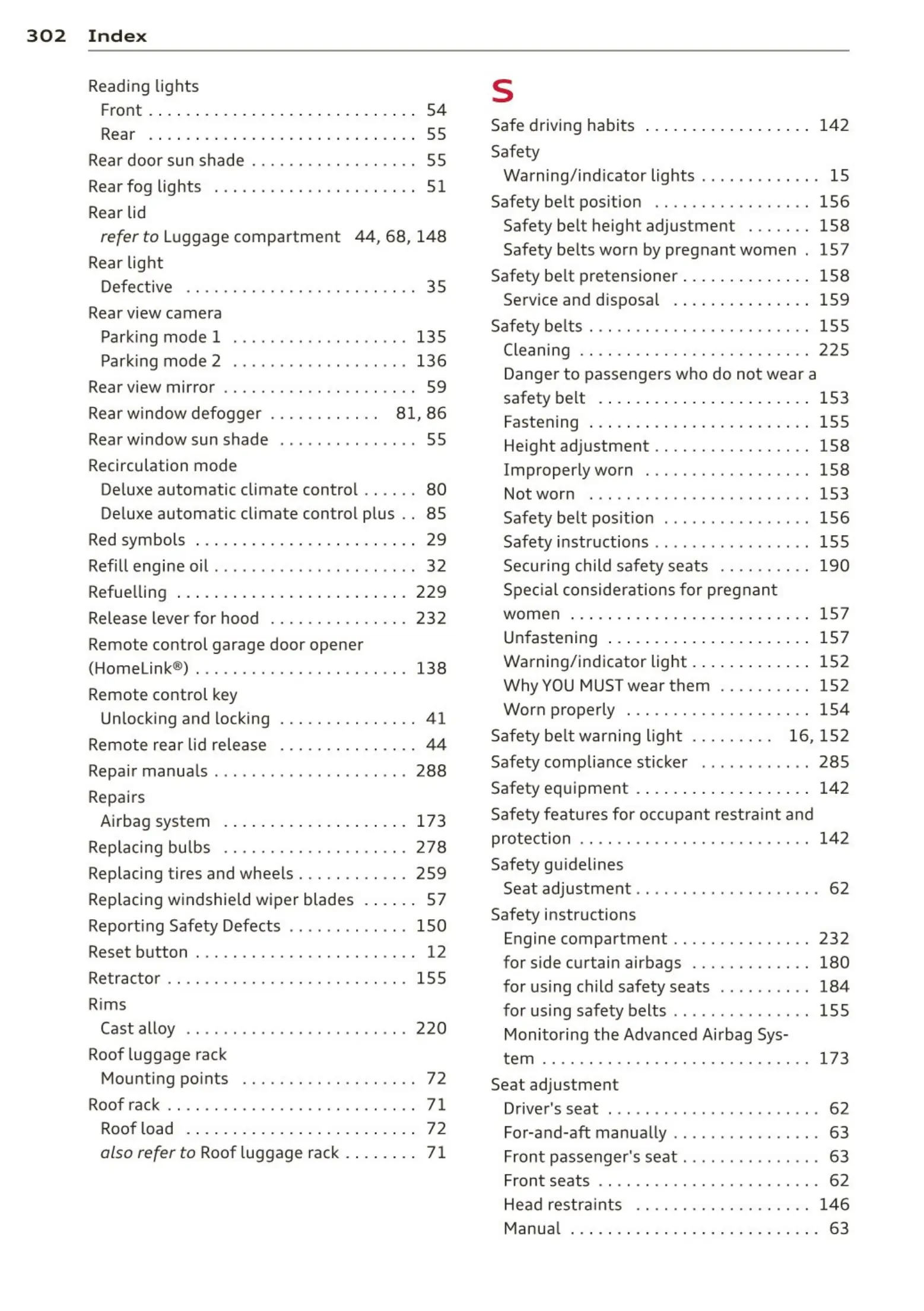 Safety belt height adjustment ..... . . 158