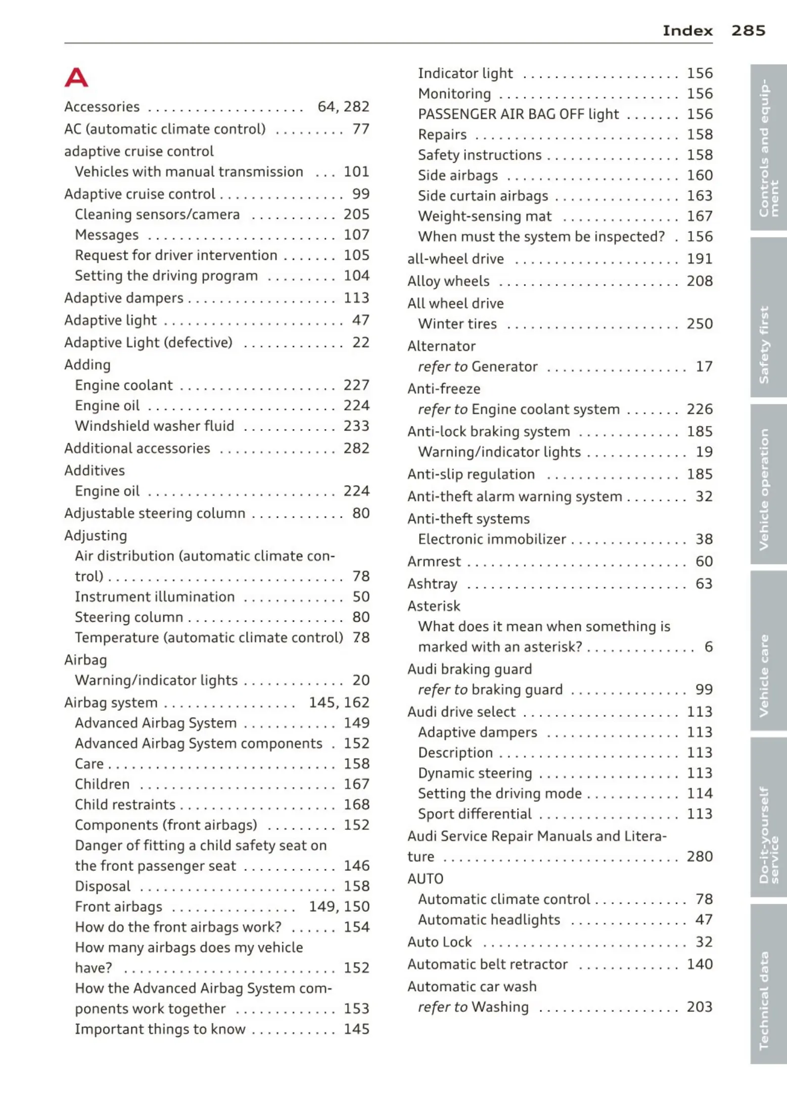 Side airbags .. . . . . . ............... 160