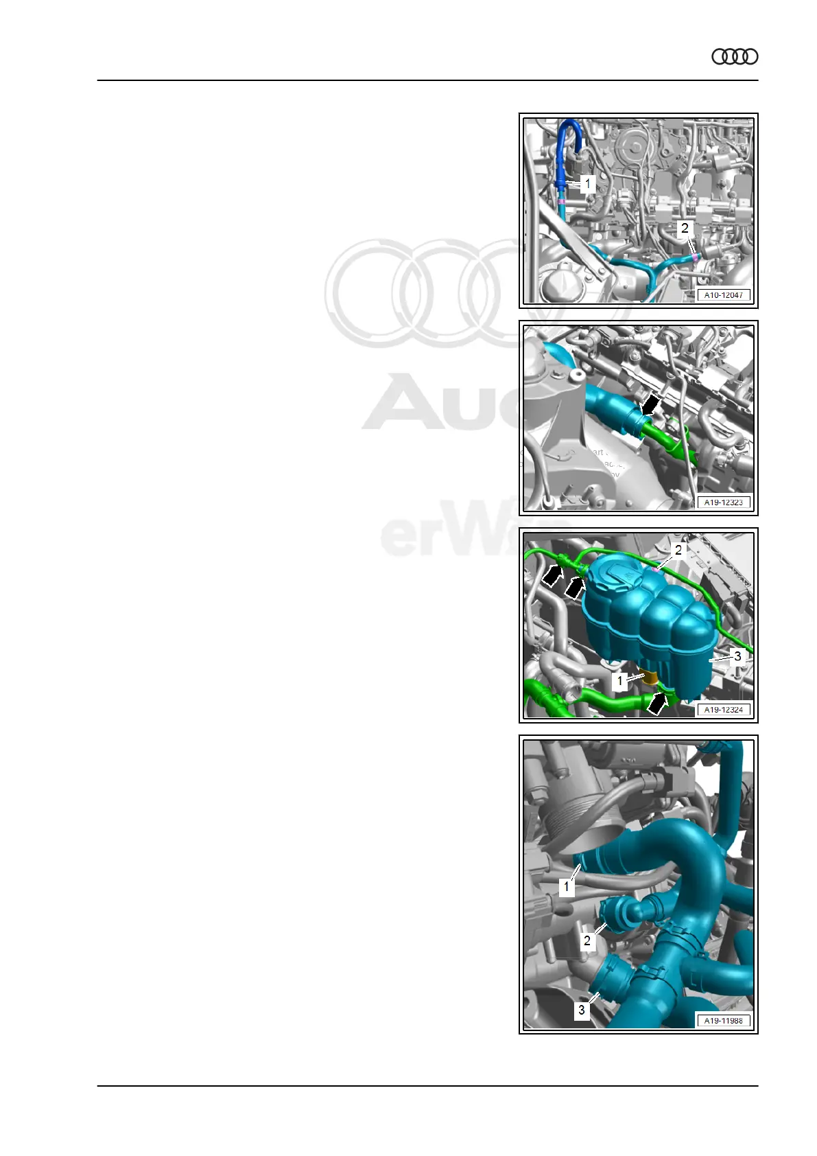 – Lift the clamp -1 and 3-, and remove the coolant hoses.