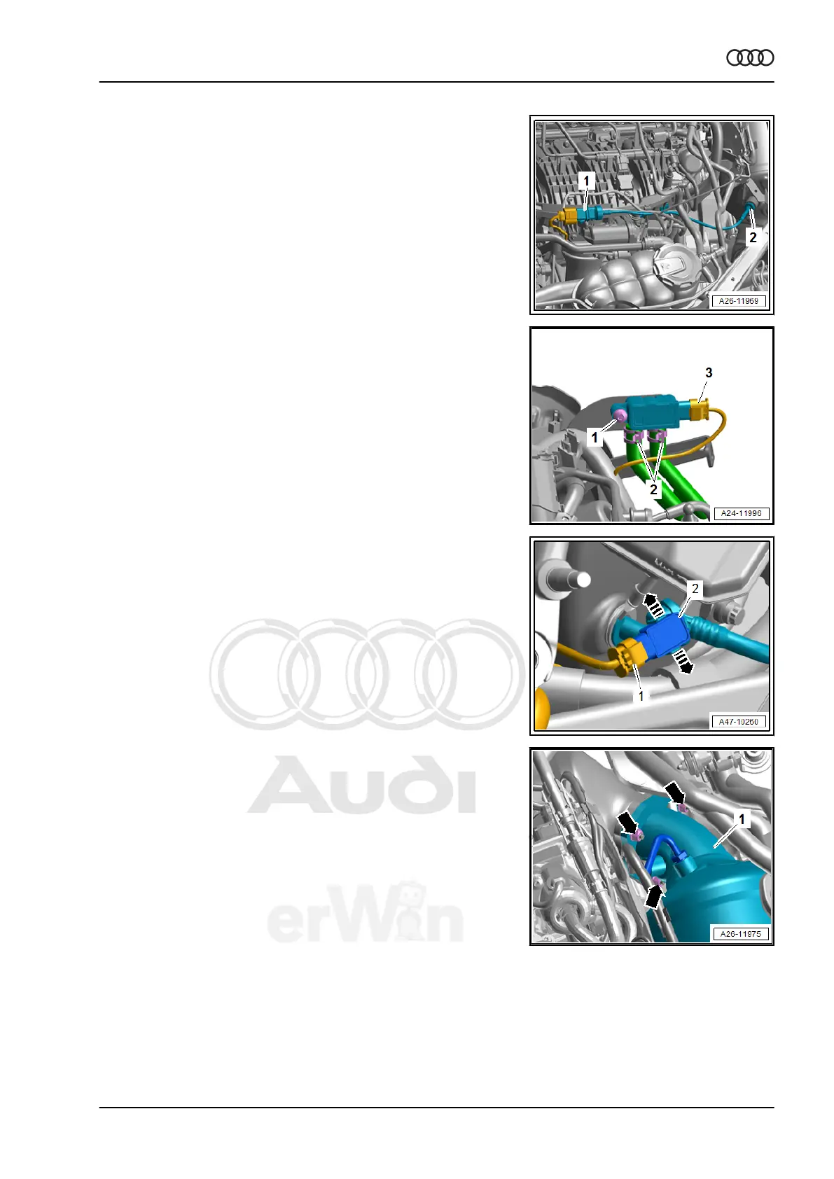 – Remove the nuts -arrows- and push the particulate filter -1- to