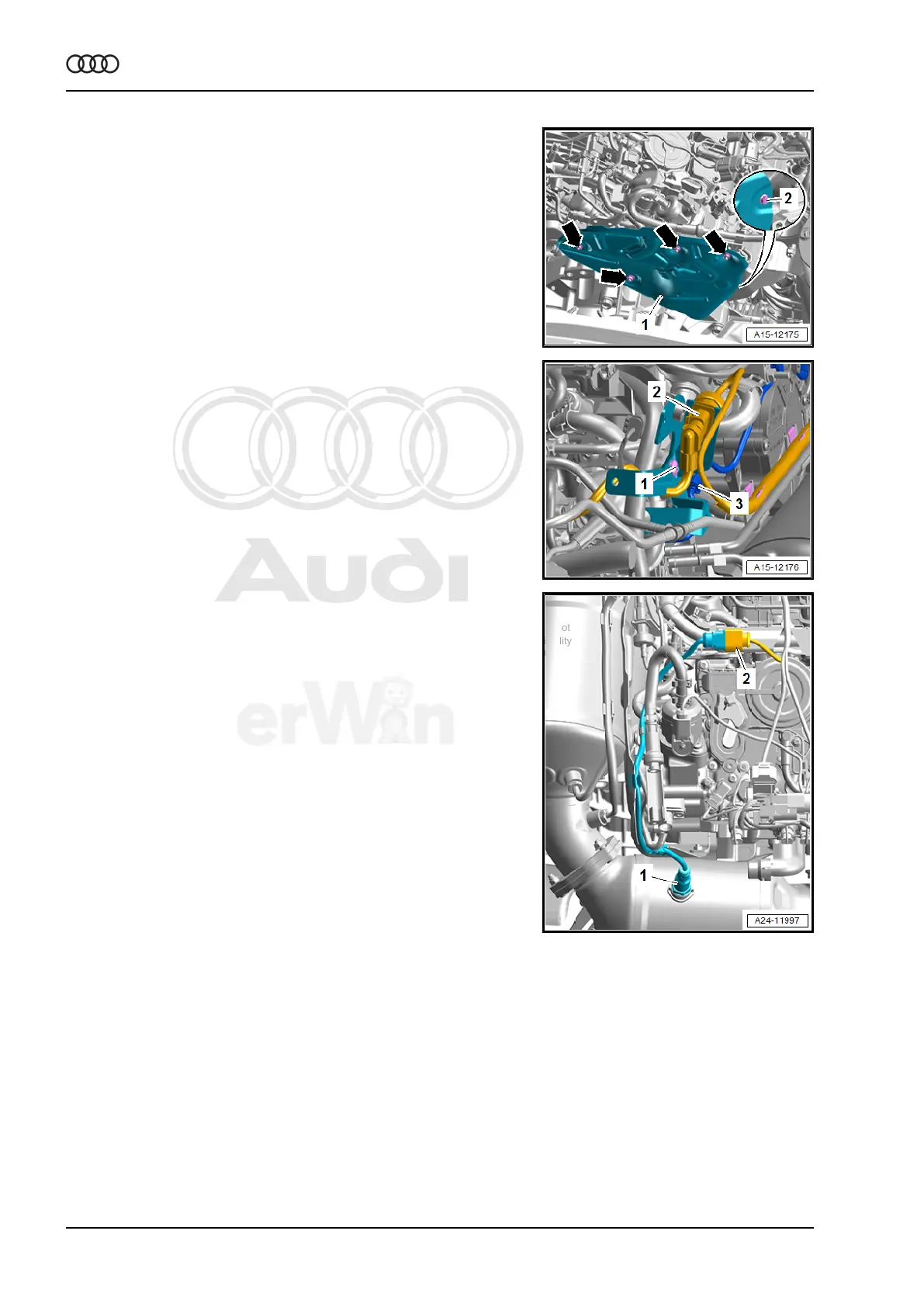 – Remove the nuts -arrows- and bolts -2- and remove the heat