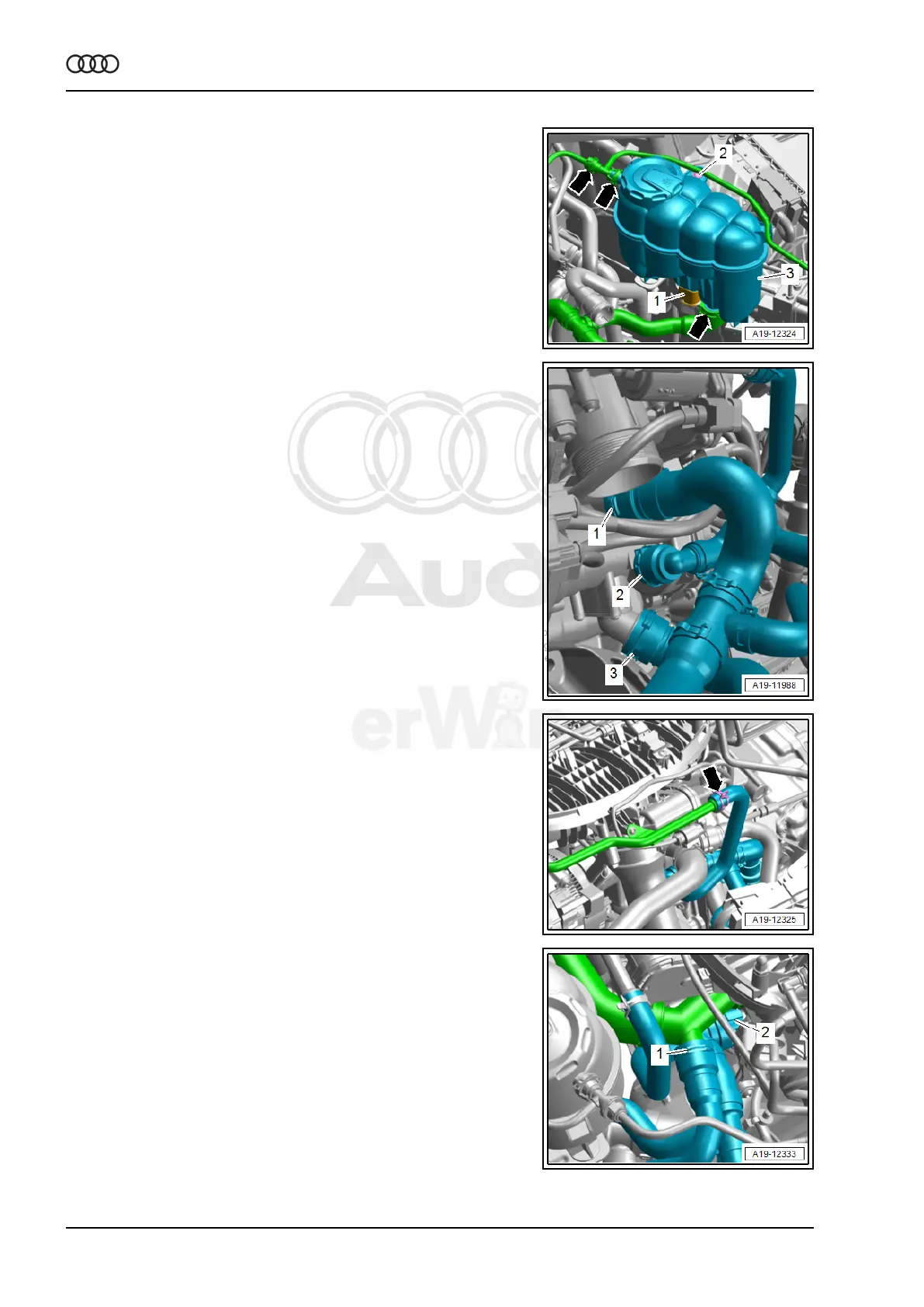– Lift the clamp -1 and 3-, and remove the coolant hoses.