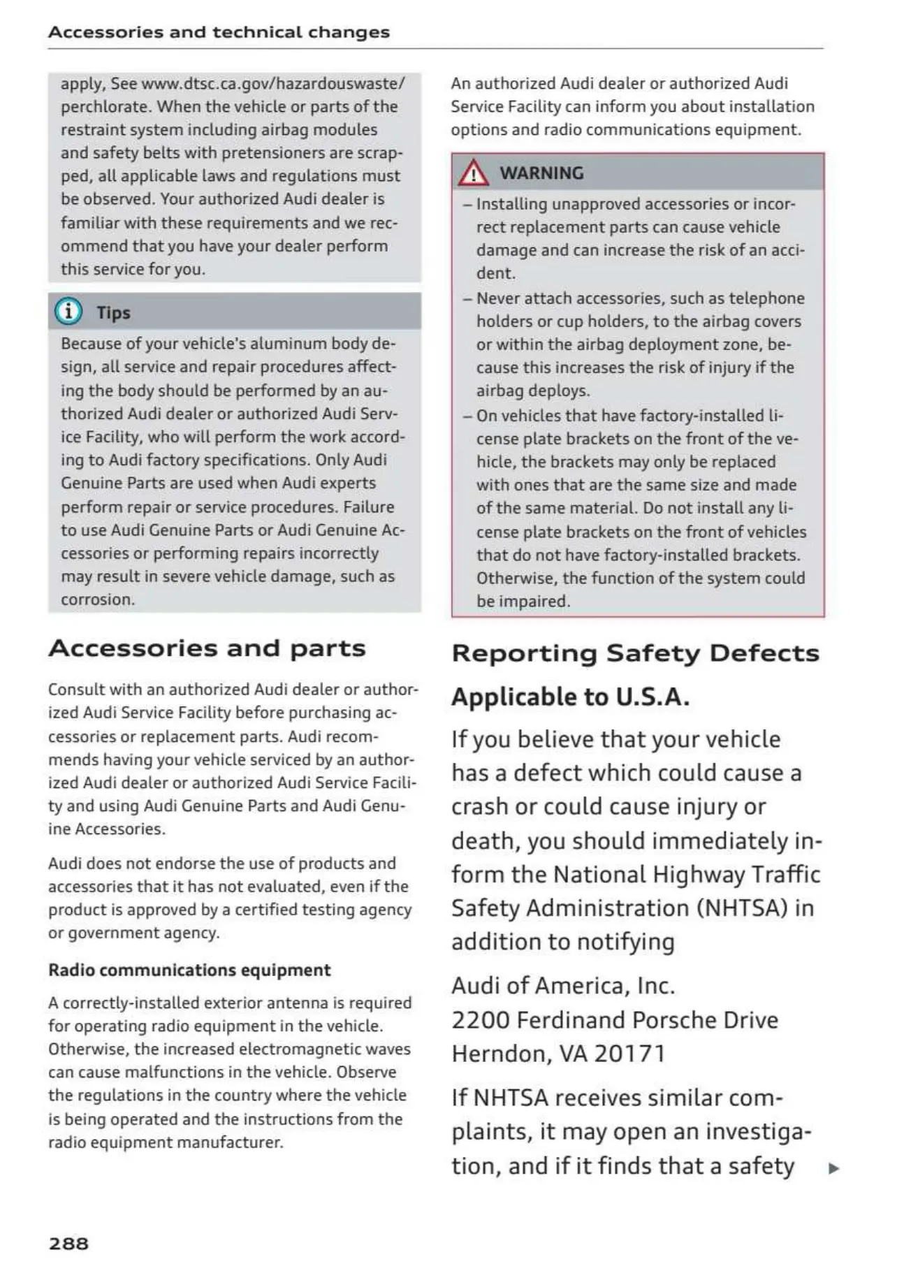 Audi A4 2023 - Accessories and Parts; Reporting Safety Defects