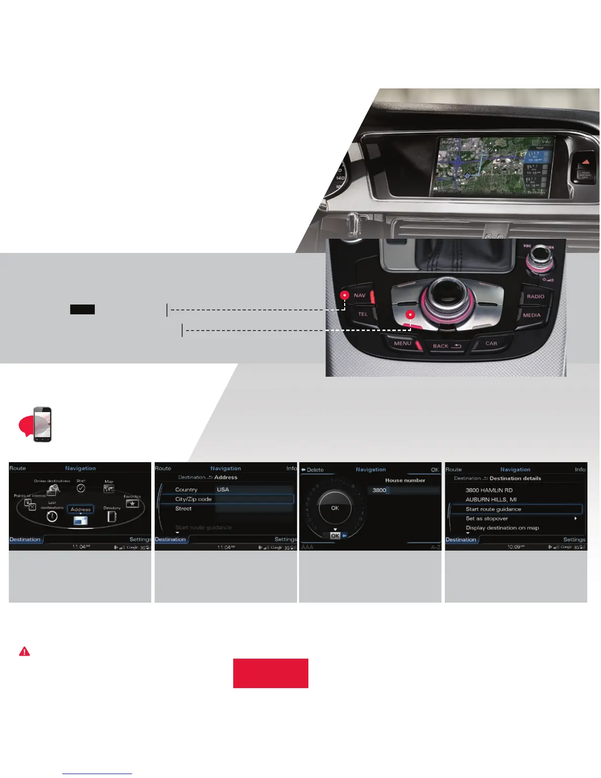 Please drive safely. Enter destinations while vehicle is stationary away from trac. Always pay careful attention to the road, and do not drive while distracted.