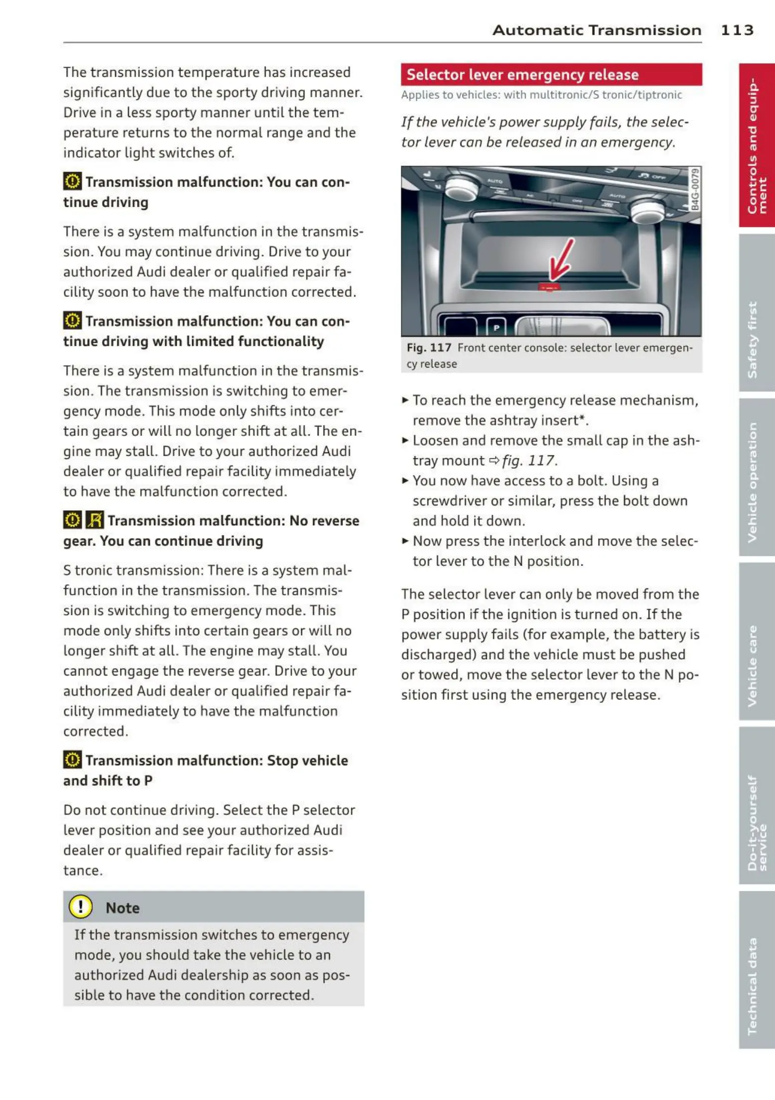 Fig. 1 17 Front center console: se lector lever emergen ·