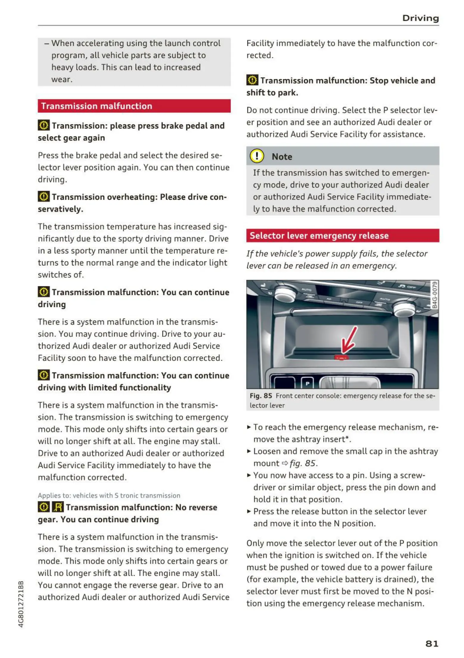 Fig. 85 Front center conso le: eme rgency release for the se-