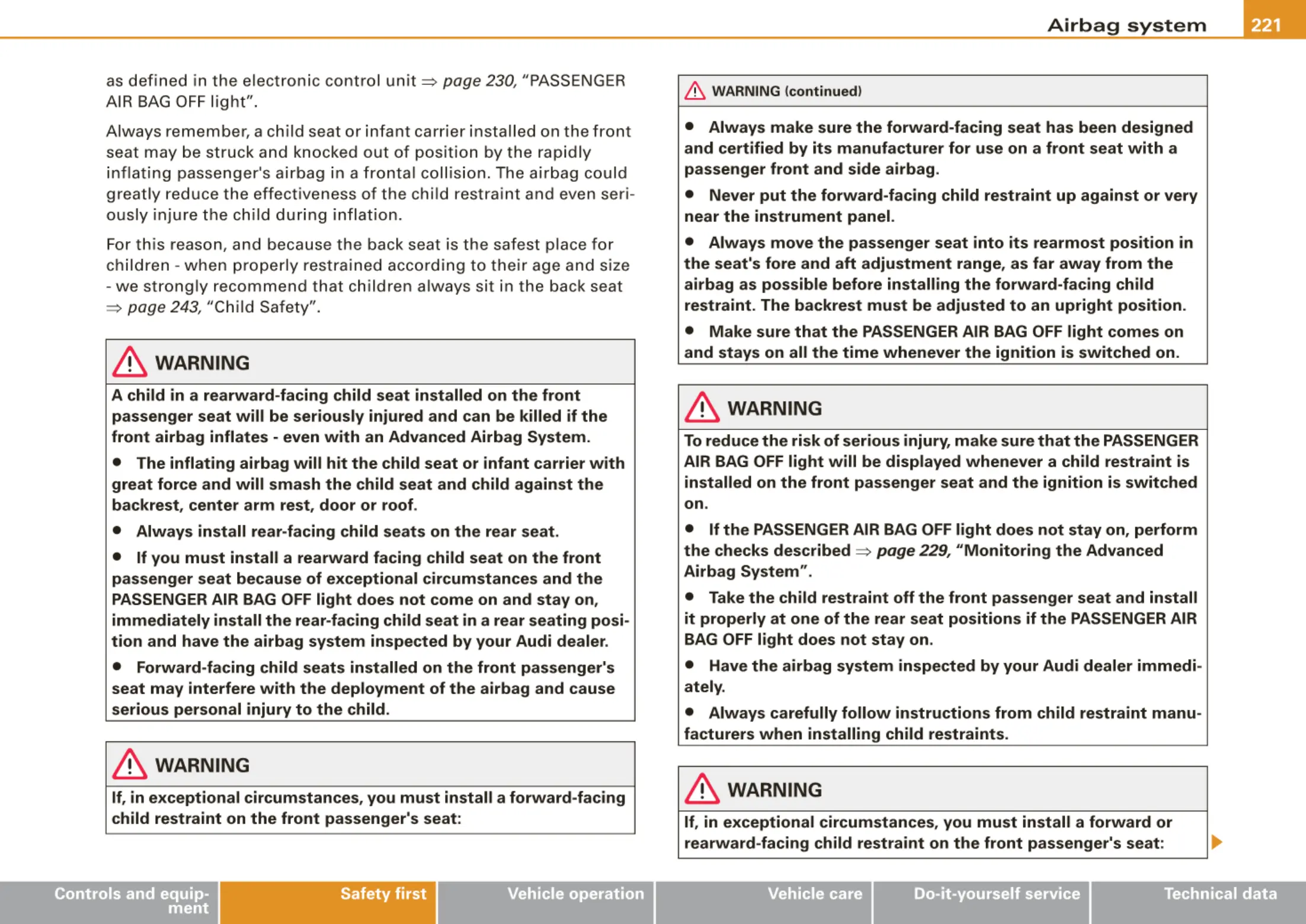 • If you must install a rearward facing child seat on the front