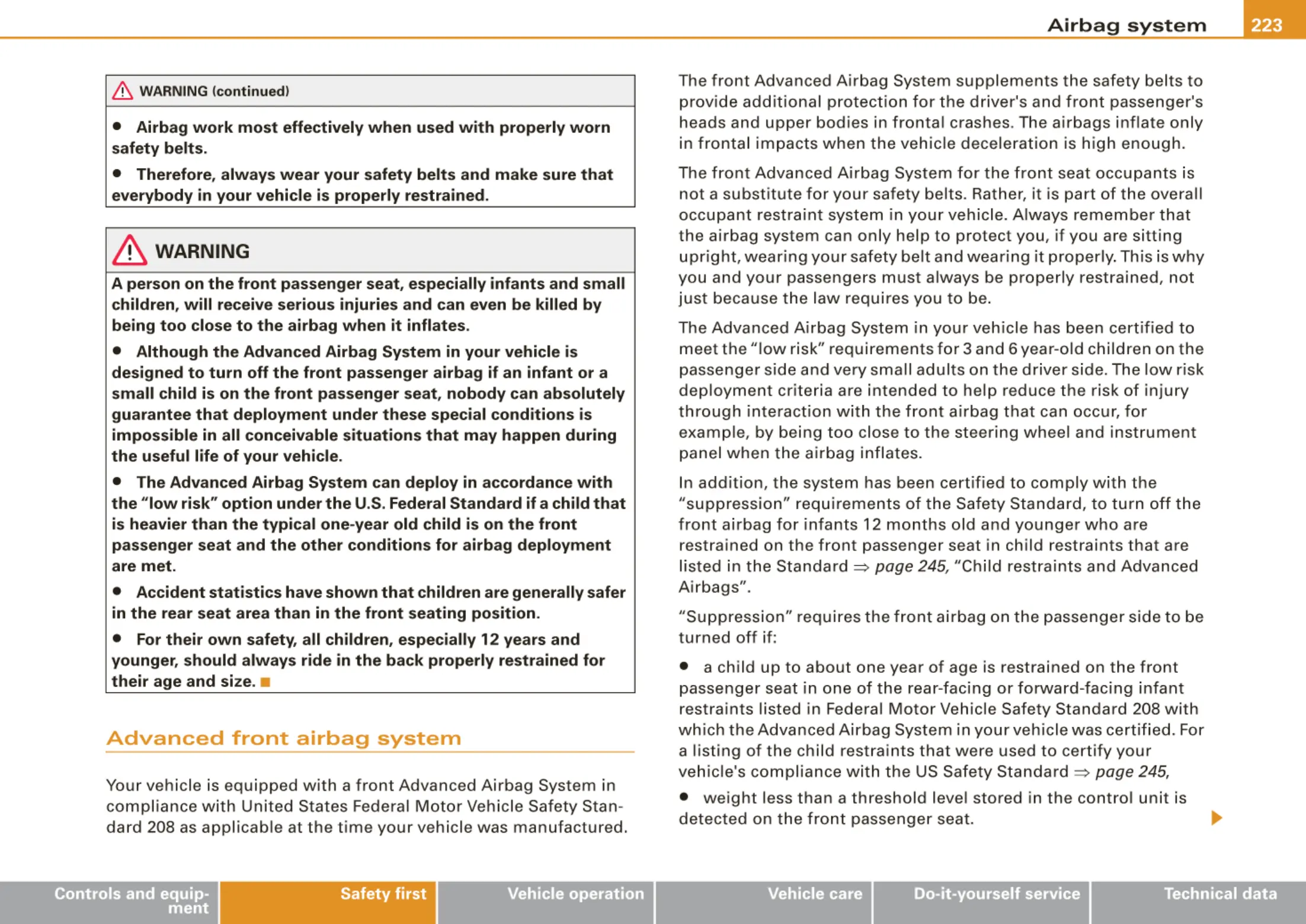 The front Advanced Airbag System supplements the safety belts to