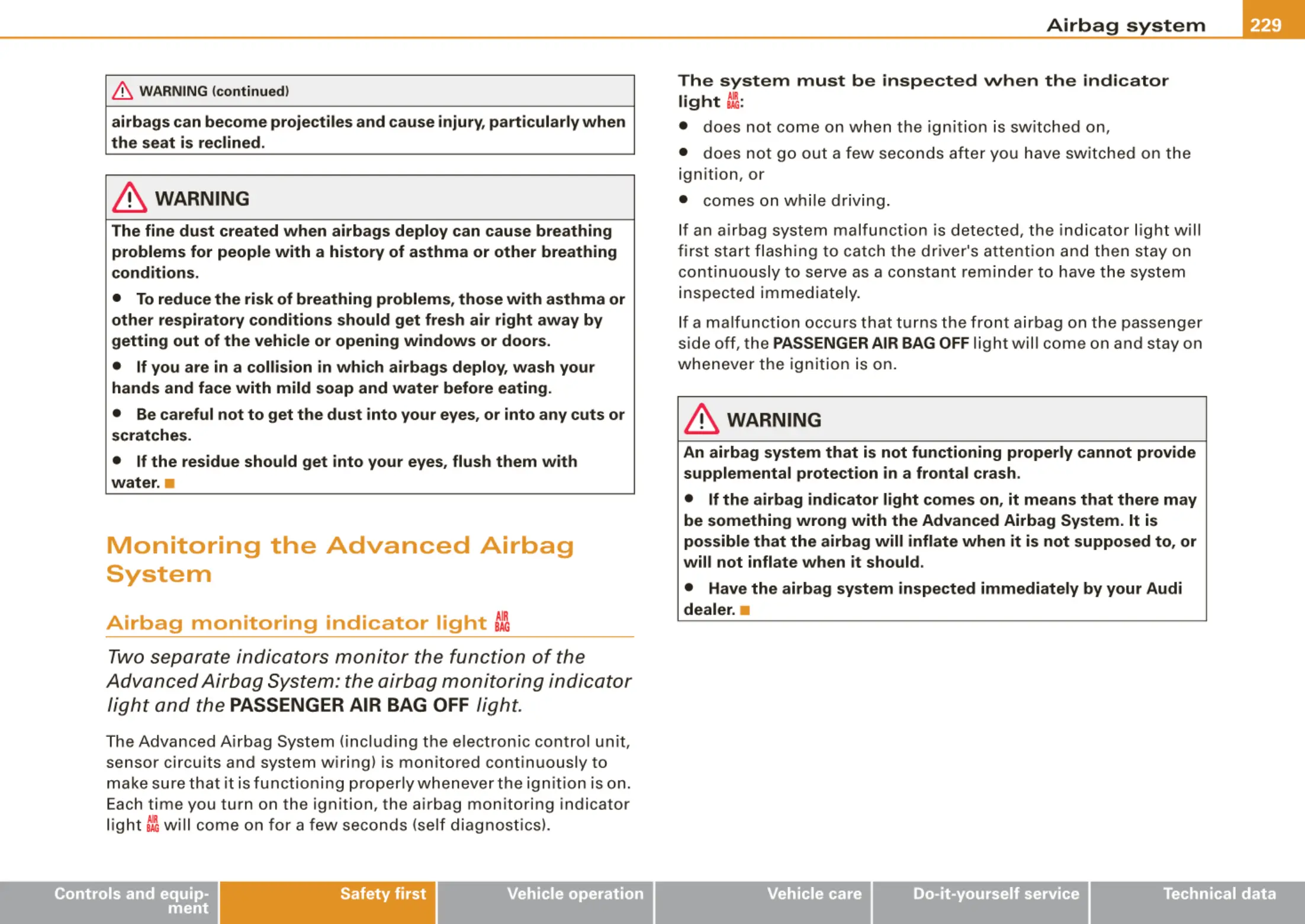 • Have the airbag system inspected immediately by your Audi