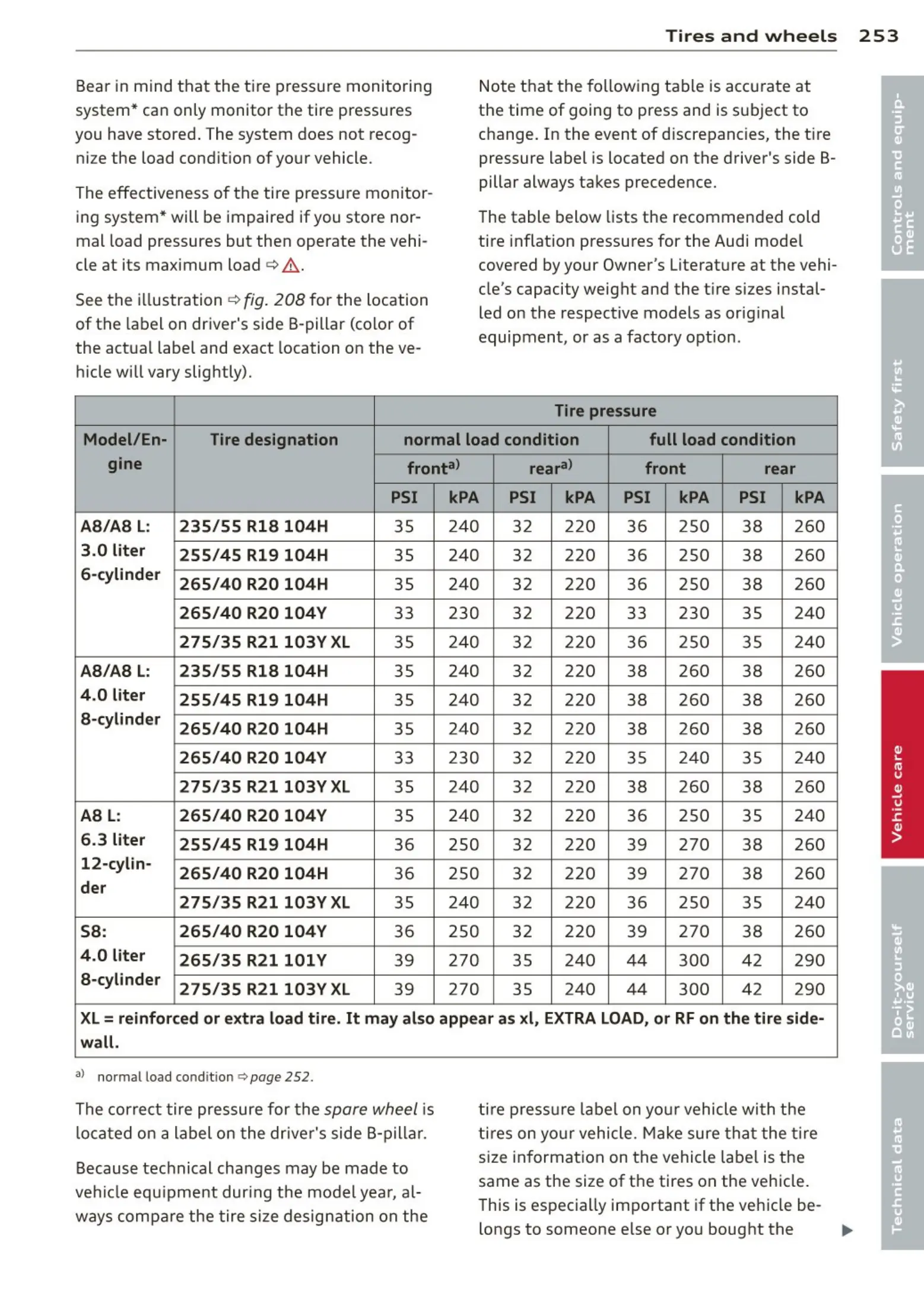 tire inflat ion pressures for the Audi mode l