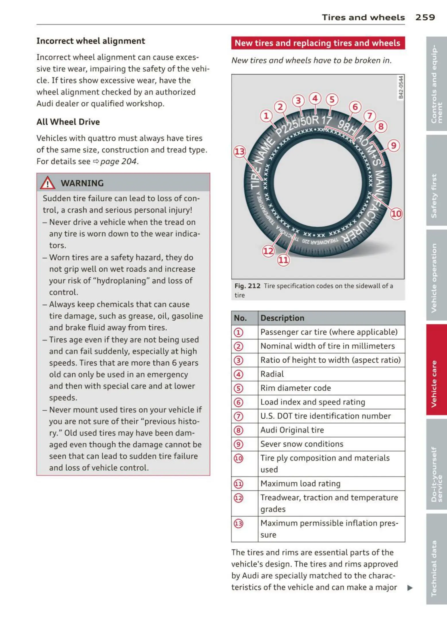 Fig. 212 Tire specificat ion codes on t he sidewall of a