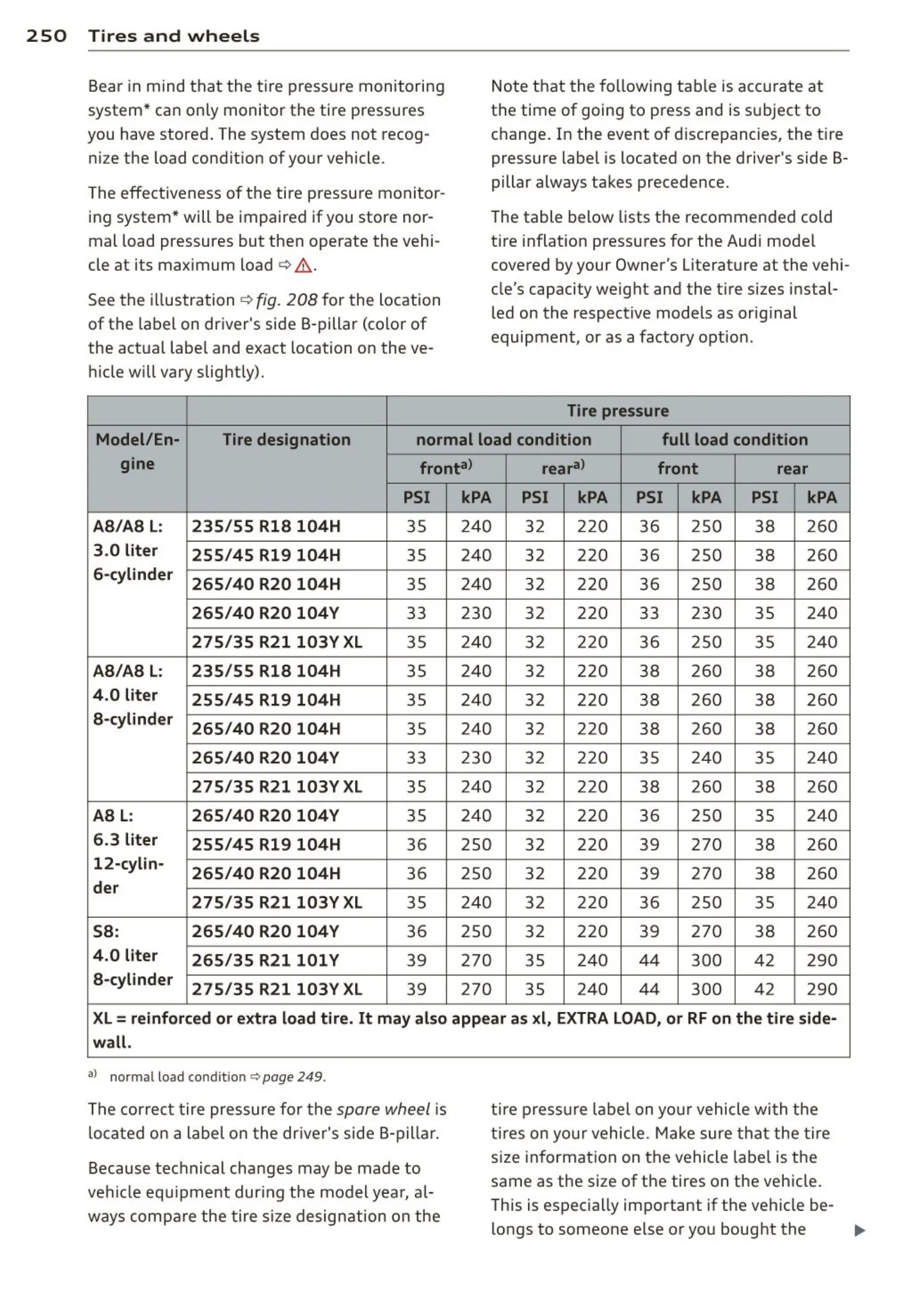 t ire inflation pressures for the Audi mode l