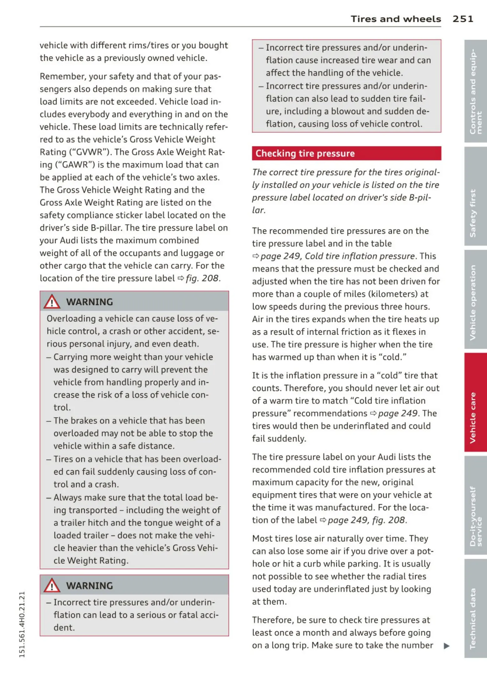 ¢ page 249 , Cold tire inflation pressure. This